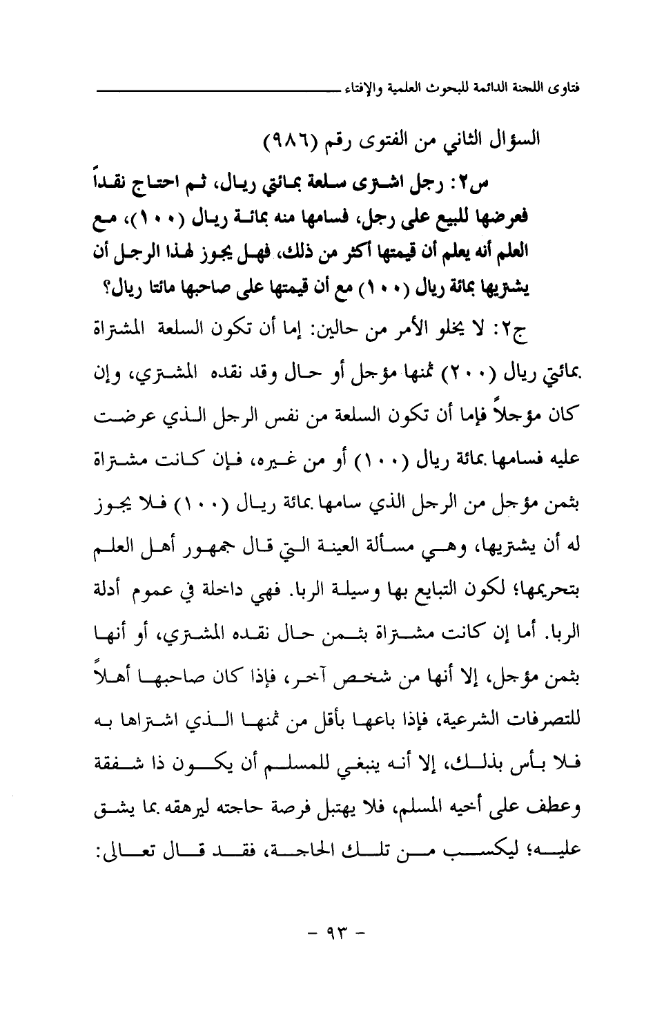 ج2: لا يخلو الأمر من حالين: إما أن تكون السلعة المشتراة بمائتي ريال (200) ثمنها مؤجل أو حال وقد نقده المشتري، وإن كان مؤجلا فإما أن تكون السلعة من نفس الرجل الذي عرضت عليه فسامها بمائة ريال (100) أو من غيره، فإن كانت مشتراة بثمن مؤجل من الرجل الذي سامها بمائة ريال (100) فلا يجوز له أن يشتريها، وهي مسألة العينة التي قال جمهور أهل العلم بتحريمها؛ لكون التبايع بها وسيلة الربا. فهي داخلة في عموم أدلة الربا.