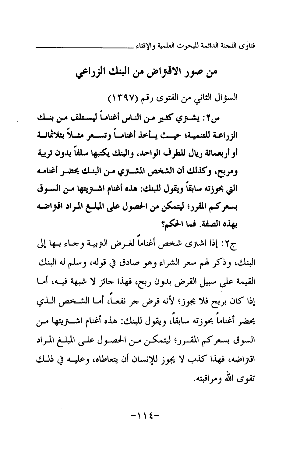 ج2: إذا اشترى شخص أغناما لغرض التربية وجاء بها إلى البنك، وذكر لهم سعر الشراء وهو صادق في قوله، وسلم له البنك القيمة على سبيل القرض بدون ربح؛ فهذا جائز لا شبهة فيه. أما إذا كان بربح فلا يجوز؛ لأنه قرض جر نفعا، أما الشخص الذي يحضر أغناما بحوزته سابقا، ويقول للبنك: هذه أغنام اشتريتها من السوق بسعركم المقرر؛ ليتمكن من الحصول على المبلغ المراد اقتراضه، فهذا كذب لا يجوز للإنسان أن يتعاطاه، وعليه في ذلك تقوى الله ومراقبته.
