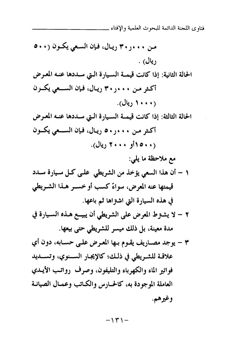 30000 ريال، فإن السعي يكون (500 ريال) . الحالة الثانية: إذا كانت قيمة السيارة التي سددها عنه المعرض أكثر من 30000 ريال، فإن السعي يكون (1000 ريال) . الحالة الثالثة: إذا كانت قيمة السيارة التي سددها عنه المعرض أكثر من 50000 ريال، فإن السعي يكون (1500 أو 2000 ريال) . مع ملاحظة ما يلي: 1- أن هذا السعي يؤخذ من الشريطي على كل سيارة سدد قيمتها عنه المعرض، سواء كسب أو خسر هذا الشريطي في هذه السيارة التي اشتراها ثم باعها. 2- لا يشترط المعرض على الشريطي أن يبيع هذه السيارة في مدة معينة، بل ذلك ميسر للشريطي حتى بيعها. 3- يوجد مصاريف يقوم بها المعرض على حسابه، دون أي علاقة للشريطي في ذلك، كالإيجار السنوي، وتسديد فواتير الماء والكهرباء والتليفون، وصرف رواتب الأيدي العاملة الموجودة به، كالحارس والكاتب وعمال الصيانة وغيرهم.