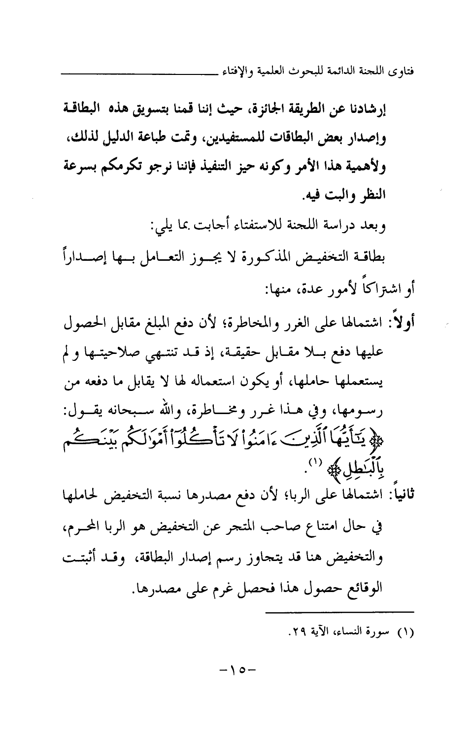 وبعد دراسة اللجنة للاستفتاء أجابت بما يلي: بطاقة التخفيض المذكورة لا يجوز التعامل بها إصدارا واشتراكا لأمور عدة، منها: أولا: اشتمالها على الغرر والمخاطرة؛ لأن دفع المبلغ مقابل الحصول عليها دفع بلا مقابل حقيقة، إذ قد تنتهي صلاحيتها ولم يستعملها حاملها، أو يكون استعماله لها لا يقابل ما دفعه من رسومها، وفي هذا غرر ومخاطرة، والله سبحانه يقول: {يَا أَيُّهَا الَّذِينَ آمَنُوا لَا تَأْكُلُوا أَمْوَالَكُمْ بَيْنَكُمْ بِالْبَاطِلِ} (¬1) ثانيا: اشتمالها على الربا؛ لأن دفع مصدرها نسبة التخفيض لحاملها في حال امتناع صاحب المتجر عن التخفيض هو الربا المحرم، والتخفيض هنا قد يتجاوز رسم إصدار البطاقة، وقد أثبتت الوقائع حصول هذا فحصل غرم على مصدرها.