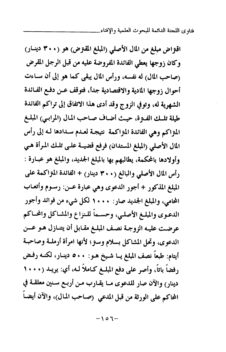اقتراض مبلغ من المال الأصلي (المبلغ المقترض) هو (300 دينار) وكان زوجها يعطي الفائدة المفروضة عليه من قبل الرجل المقرض (صاحب المال) له نفسه، ورأس المال يبقى كما هو إلى أن ساءت أحوال زوجها المادية والاقتصادية جدا، فتوقف عن دفع الفائدة الشهرية له، وتوفي الزوج وقد أدى هذا الاتفاق إلى تراكم الفائدة طيلة كلك الفترة، حيث أضاف صاحب المال (المرابي) المبلغ المتراكم وهي الفائدة المتراكمة نتيجة لعدم سدادها له إلى رأس المال الأصلي (المبلغ المستدان) فرفع قضية على تلك المرأة هي وأولادها بالمحكمة، يطالبهم بها بالمبلغ الجديد، والمبلغ هو عبارة: رأس المال الأصلي والبالغ (300 دينار) + الفائدة المتراكمة على المبلغ المذكور + أجور الدعوى وهي عبارة عن: رسوم وأتعاب المحامي، والمبلغ الجديد صار: 1000 لكل شيء من فوائد وأجور الدعوى والمبلغ الأصلي، وحسما للنزاع والمشاكل والمحاكم عرضت عليه الزوجة نصف المبلغ مقابل أن يتنازل هو عن الدعوى، وتحل المشاكل بسلام وستر؛ لأنها امرأة أرملة وصاحبة أيتام: طبعا نصف المبلغ يا شيخ هو: 550 دينارا، لكنه رفض رفضا باتا، وأصر على دفع المبلغ كاملا له، أي: يريد (1000 دينار) والآن صار للدعوى ما يقارب من أربع سنين معلقة في المحاكم على الورثة من قبل المدعي (صاحب المال) ، والآن أيضا