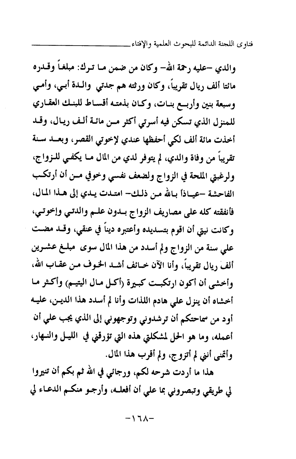 والدي -عليه رحمة الله- وكان من ضمن ما ترك: مبلغا وقدره مائتا ألف ريال تقريبا، وكان ورثته هم: جدتي والدة أبي، وأمي وسبعة بنين وأربع بنات، وكان بذمته أقساط للبنك العقاري للمنزل الذي تسكن فيه أسرتي أكثر من مائة ألف ريال، وقد أخذت مائة ألف لكي أحفظها عندي لإخوتي القصر، وبعد سنة تقريبا من وفاة والدي، لم يتوفر لدي من المال ما يكفي للزواج، ولرغبتي الملحة في الزواج ولضعف نفسي وخوفي من أن أرتكب الفاحشة- عياذا بالله من ذلك- امتدت يدي إلى هذا المال، فأنفقته كله على مصاريف الزواج بدون علم والدتي وإخوتي، وكانت نيتي أن أقوم بتسديده وأعتبره دينا في عنقي، وقد مضى علي سنة من الزواج ولم أسدد من هذا المال سوى مبلغ عشرين ألف ريال تقريبا، وأنا الآن خائف أشد الخوف من عقاب الله، وأخشى أن أكون ارتكبت كبيرة (أكل مال اليتيم) وأكثر ما أخشاه أن ينزل علي هادم اللذات وأنا لم أسدد هذا الدين، عليه أود من سماحتكم أن ترشدوني وتوجهوني إلى الذي يجب علي أن أعمله، وما هو الحل لمشكلتي هذه التي تؤرقني في الليل والنهار، وأتمنى أنني لم أتزوج، ولم أقرب هذا المال. هذا ما أردت شرحه لكم، ورجائي في الله ثم بكم أن تنيروا لي طريقي وتبصروني بما علي أن أفعله، وأرجو منكم الدعاء لي