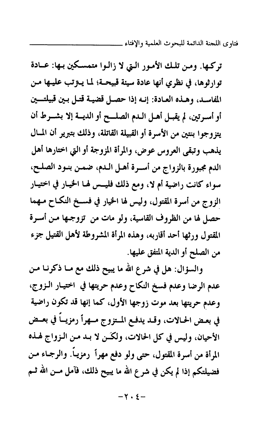 تركها. ومن تلك الأمور التي لا زالوا متمسكين بها: عادة توارثوها، في نظري أنها عادة سيئة قبيحة؛ لما يترتب عليها من المفاسد، وهذه العادة: إنه إذا حصل قضية قتل بين قبيلتين أو أسرتين، لم يقبل أهل الدم الصلح أو الدية إلا بشرط أن يتزوجوا بنتين من الأسرة أو القبيلة القاتلة، وذلك بتبرير أن المال يذهب وتبقى العروس عوض، والمرأة المزوجة أو التي اختارها أهل الدم مجبورة بالزواج من أسرة أهل الدم، ضمن بنود الصلح، سواء كانت راضية أم لا، ومع ذلك فليس لها الخيار في اختيار الزوج من أسرة المقتول، وليس لها الخيار في فسخ النكاح مهما حصل لها من الظروف القاسية، ولو مات من تزوجها من أسرة المقتول ورثها أحد أقاربه، وهذه المرأة المشروطة لأهل القتيل جزء من الصلح أو الدية المتفق عليها. والسؤال: هل في شرع الله ما يبيح ذلك مع ما ذكرنا من عدم الرضا وعدم فسخ النكاح وعدم حريتها في اختيار الزوج، وعدم حريتها بعد موت زوجها الأول، كما إنها قد تكون راضية في بعض الحالات، وقد يدفع المتزوج مهرا رمزيا في بعض الأحيان، وليس في كل الحالات، ولكن لا بد من الزواج لهذه المرأة من أسرة المقتول، حتى ولو دفع مهرا رمزيا. والرجاء من فضيلتكم إذا لم يكن في شرع الله ما يبيح ذلك، فآمل من الله ثم