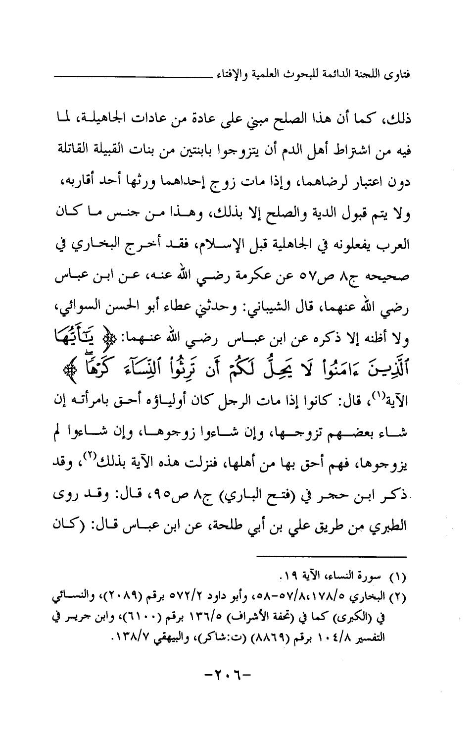 ذلك، كما أن هذا الصلح مبني على عادة من عادات الجاهلية، لما فيه من اشتراط أهل الدم أن يتزوجوا بابنتين من بنات القبيلة القاتلة دون اعتبار لرضاهما، وإذا مات زوج إحداهما ورثها أحد أقاربه، ولا يتم قبول الدية والصلح إلا بذلك، وهذا من جنس ما كان العرب يفعلونه في الجاهلية قبل الإسلام، فقد أخرج البخاري في صحيحه ج8 ص57 عن عكرمة رضي الله عنه، عن ابن عباس رضي الله عنهما، قال الشيباني وحدثني عطاء أبو الحسن السوائي ولا أظنه إلا ذكره عن ابن عباس رضي الله عنهما: {يَا أَيُّهَا الَّذِينَ آمَنُوا لَا يَحِلُّ لَكُمْ أَنْ تَرِثُوا النِّسَاءَ كَرْهًا} (¬1) الآية، قال: كانوا إذا مات الرجل كان أولياؤه أحق بامرأته إن شاء بعضهم تزوجها، وإن شاءوا زوجوها، وإن شاءوا لم يزوجوها، فهم أحق بها من أهلها، فنزلت هذه الآية بذلك، وقد ذكر ابن حجر في (فتح الباري) ج8 ص95، قال: وقد روى الطبري من طريق علي بن أبي طلحة عن ابن عباس