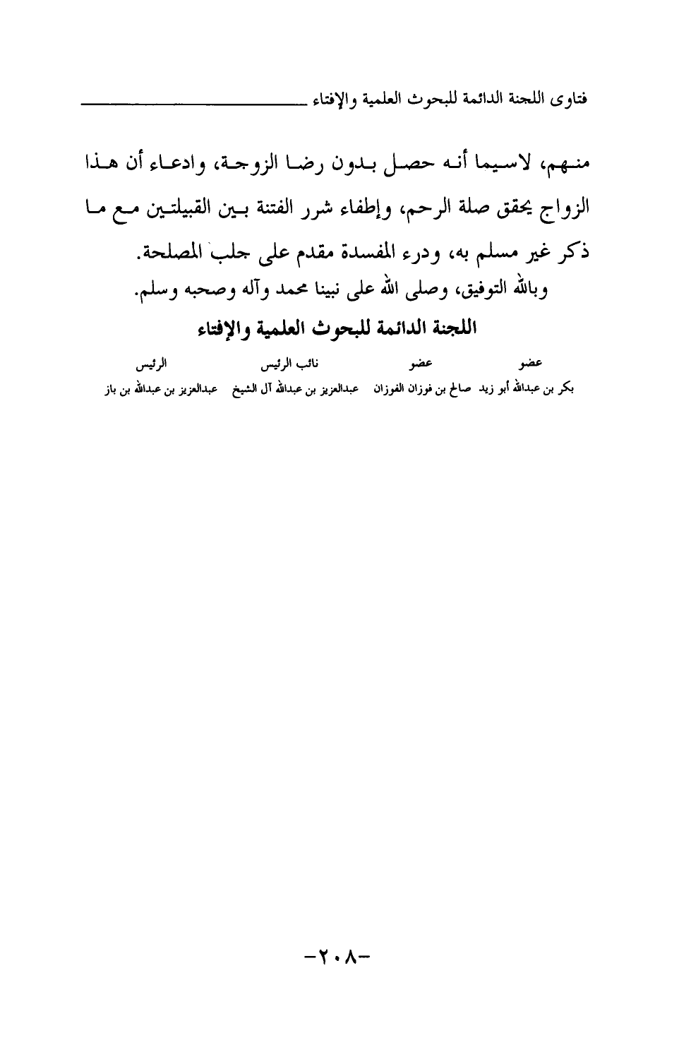 منهم، لا سيما أنه حصل بدون رضا الزوجة، وادعاء أن هذا الزواج يحقق صلة الرحم، وإطفاء شرر الفتنة بين القبيلتين مع ما ذكر غير مسلم به، ودرء المفسدة مقدم على جلب المصلحة. وبالله التوفيق، وصلى الله على نبينا محمد وآله وصحبه وسلم.