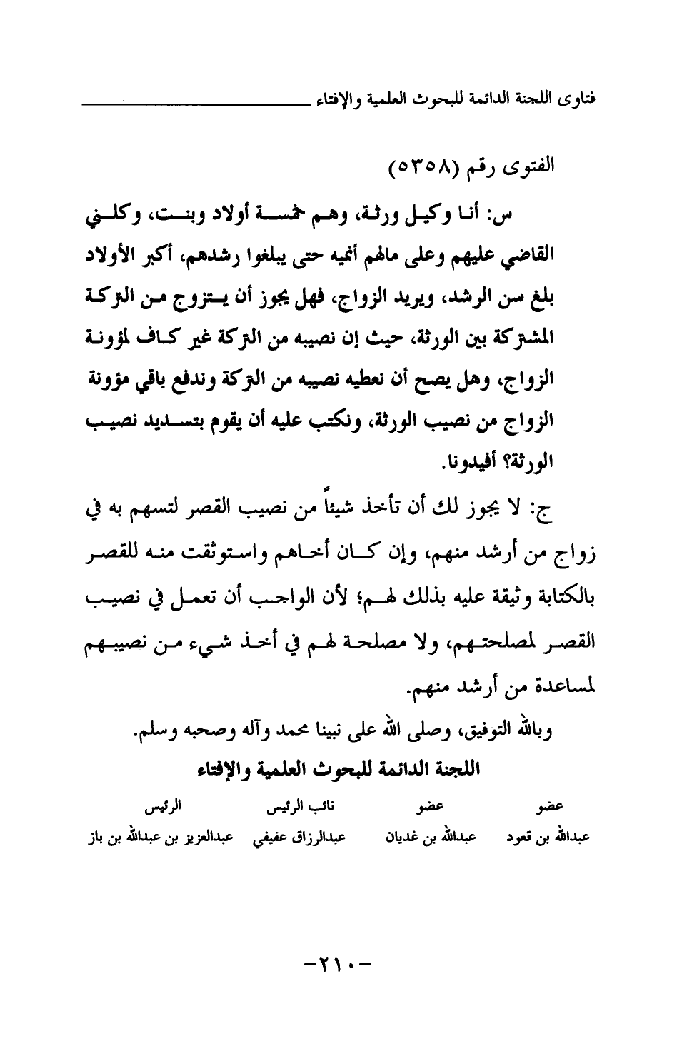 ج: لا يجوز لك أن تأخذ شيئا من نصيب القصر لتسهم به في زواج من أرشد منهم، وإن كان أخاهم واستوثقت منه للقصر بالكتابة وثيقة عليه بذلك لهم؛ لأن الواجب أن تعمل في نصيب القصر لمصلحتهم، ولا مصلحة لهم في أخذ شيء من نصيبهم لمساعدة من أرشد منهم. وبالله التوفيق، وصلى الله على نبينا محمد وآله وصحبه وسلم.