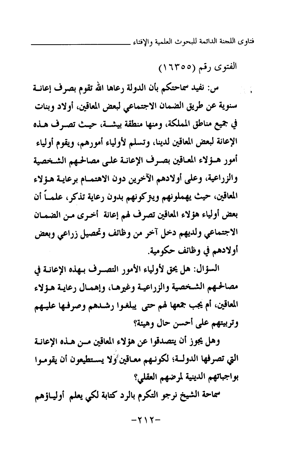 س: نفيد سماحتكم بأن الدولة -رعاها الله- تقوم بصرف إعانة سنوية عن طريق الضمان الاجتماعي لبعض المعاقين، أولاد وبنات في جميع مناطق المملكة، ومنها منطقة بيشة حيث تصرف هذه الإعانة لبعض المعاقين لدينا، وتسلم لأولياء أمورهم، ويقوم أولياء أمور هؤلاء المعاقين بصرف الإعانة على مصالحهم الشخصية والزراعية، وعلى أولادهم الآخرين دون الاهتمام برعاية هؤلاء المعاقين، حيث يهملونهم ويتركونهم بدون رعاية تذكر، علما أن بعض أولياء هؤلاء المعاقين تصرف لهم إعانة أخرى من الضمان الاجتماعي ولديهم دخل آخر من وظائف وتحصيل زراعي وبعض أولادهم في وظائف حكومية. السؤال: هل يحق لأولياء الأمور التصرف بهذه الإعانة في مصالحهم الشخصية والزراعية وغيرها، وإهمال رعاية هؤلاء المعاقين، أم يجب جمعها لهم حتى يبلغوا رشدهم وصرفها عليهم وتربيتهم على أحسن حال وهيئة؟ وهل يجوز أن يتصدقوا عن هؤلاء المعاقين من هذه الإعانة التي تصرفها الدولة؛ لكونهم معاقين ولا يستطيعون أن يقوموا بواجباتهم الدينية لمرضهم العقلي؟ سماحة الشيخ نرجو التكرم بالرد كتابة لكي يعلم أولياؤهم