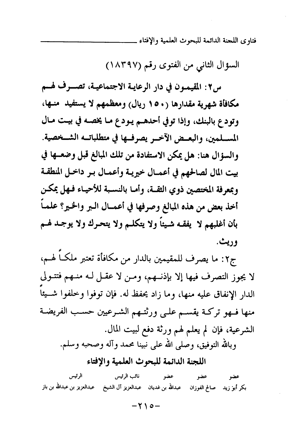 ج2: ما يصرف للمقيمين بالدار من مكافأة تعتبر ملكا لهم، لا يجوز التصرف فيها إلا بإذنهم، ومن لا عقل له منهم فتتولى الدار الإنفاق عليه منها، وما زاد يحفظ له. فإن توفوا وخلفوا شيئا منها فهو تركة يقسم على ورثتهم الشرعيين حسب الفريضة الشرعية، فإن لم يعلم لهم ورثة دفع لبيت المال. وبالله التوفيق، وصلى الله على نبينا محمد وآله وصحبه وسلم.