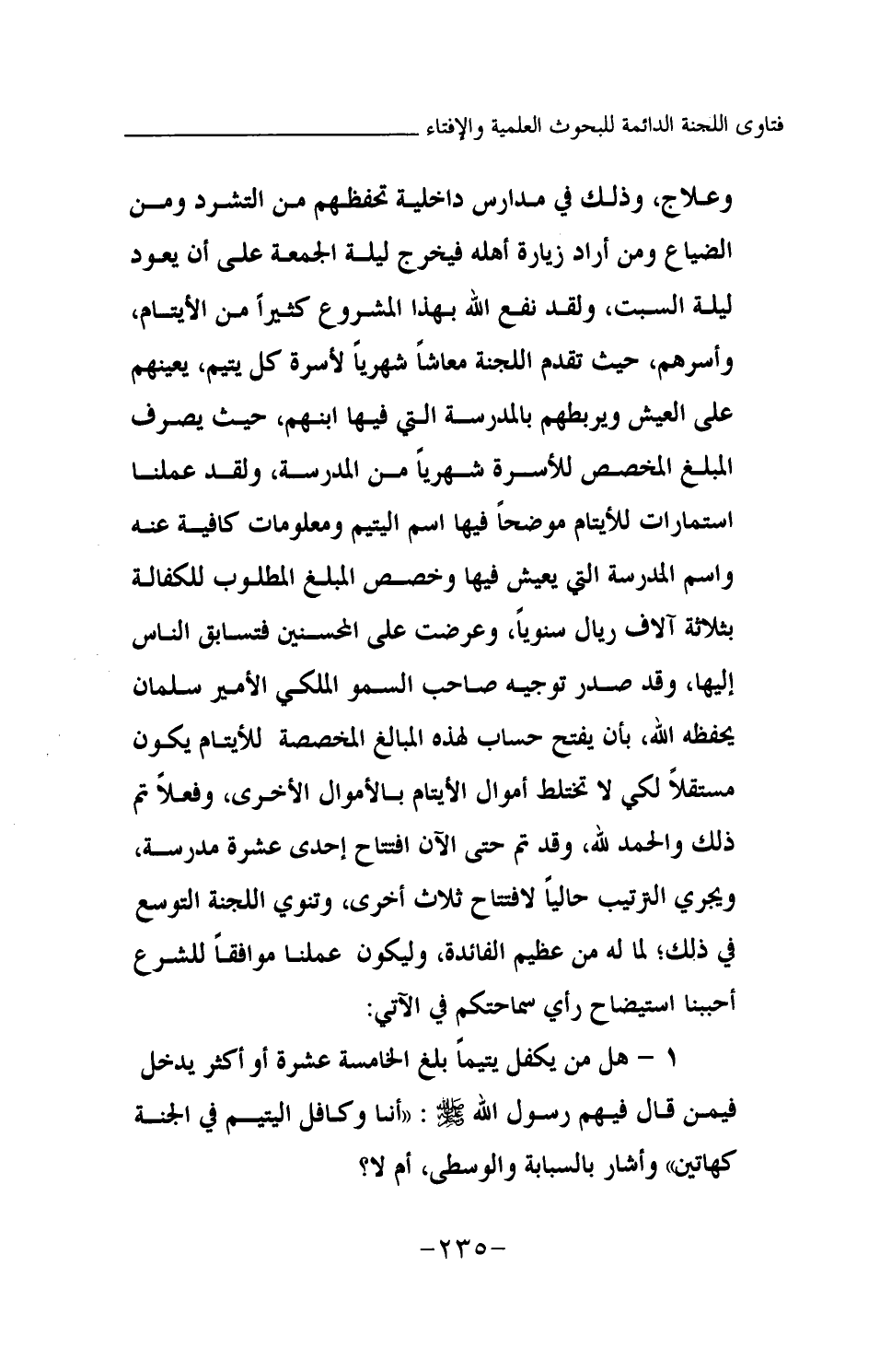 وعلاج، وذلك في مدارس داخلية تحفظهم من التشرد ومن الضياع ومن أراد زيارة أهله فيخرج ليلة الجمعة على أن يعود ليلة السبت، ولقد نفع الله بهذا المشروع كثيرا من الأيتام، وأسرهم، حيث تقدم اللجنة معاشا شهريا لأسرة كل يتيم، يعينهم على العيش ويربطهم بالمدرسة التي فيها ابنهم، حيث يصرف المبلغ المخصص للأسرة شهريا من المدرسة، ولقد عملنا استمارات للأيتام موضحا فيها اسم اليتيم ومعلومات كافية عنه اسم المدرسة التي يعيش فيها وخصص المبلغ المطلوب للكفالة بثلاثة آلاف ريال سنويا، وعرضت على المحسنين فتسابق الناس إليها، وقد صدر توجيه صاحب السمو الملكي الأمير سلمان يحفظه الله، بأن يفتح حساب لهذه المبالغ المخصصة للأيتام يكون مستقلا لكي لا تختلط أموال الأيتام بالأموال الأخرى، وفعلا تم ذلك والحمد لله، وقد تم حتى الآن افتتاح إحدى عشرة مدرسة، ويجري الترتيب حاليا لافتتاح ثلاث أخرى، وتنوي اللجنة التوسع في ذلك؛ لما له من عظيم الفائدة، وليكون عملنا موافقا للشرع أحببنا استيضاح رأي سماحتكم في الآتي: 1- هل من يكفل يتيما بلغ الخامسة عشرة أو أكثر يدخل فيمن قال فيهم رسول الله -صلى الله عليه وسلم-: «أنا وكافل اليتيم في الجنة كهاتين وأشار بالسبابة والوسطى (¬1) » أم لا؟