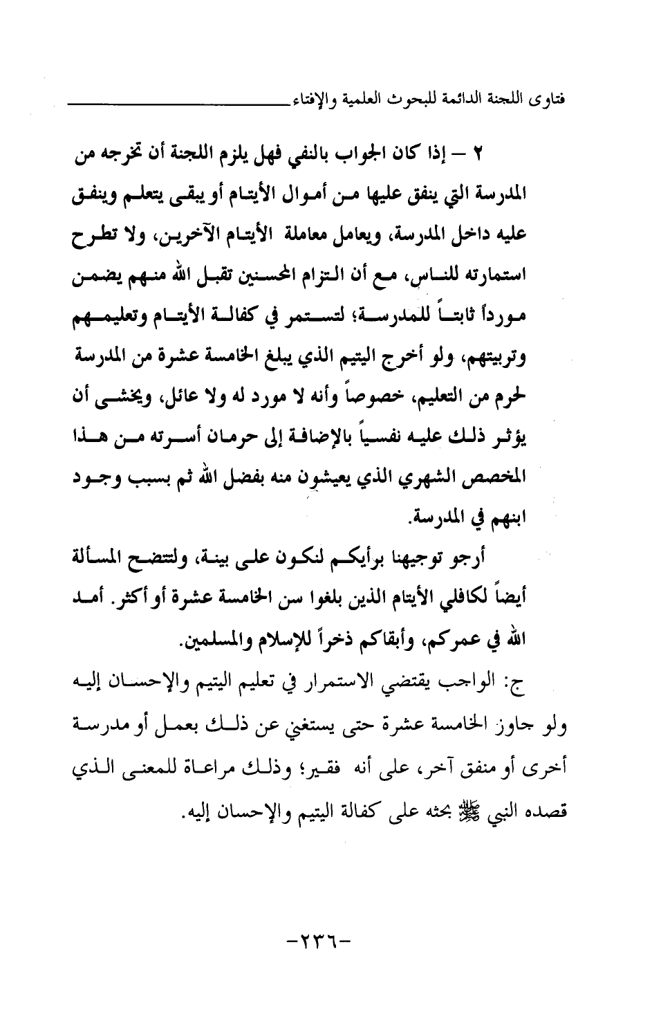 2 - إذا كان الجواب بالنفي فهل يلزم اللجنة أن تخرجه من المدرسة التي ينفق عليها من أموال الأيتام أو يبقى يتعلم وينفق عليه داخل المدرسة، ويعامل معاملة الأيتام الآخرين، ولا تطرح استمارته للناس، مع أن التزام المحسنين -تقبل الله منهم- يضمن موردا ثابتا للمدرسة؛ لتستمر في كفالة الأيتام وتعليمهم وتربيتهم، ولو أخرج اليتيم الذي يبلغ الخامسة عشرة من المدرسة لحرم من التعليم، خصوصا وأنه لا مورد له ولا عائل، ويخشى أن يؤثر ذلك عليه نفسيا بالإضافة إلى حرمان أسرته من هذا المخصص الشهري الذي يعيشون منه بفضل الله ثم بسبب وجود ابنهم في المدرسة. أرجو توجيهنا برأيكم لنكون على بينة، ولتتضح المسألة أيضا لكافلي الأيتام الذين بلغوا سن الخامسة عشرة أو أكثر. أمد الله في عمركم، وأبقاكم ذخرا للإسلام والمسلمين.