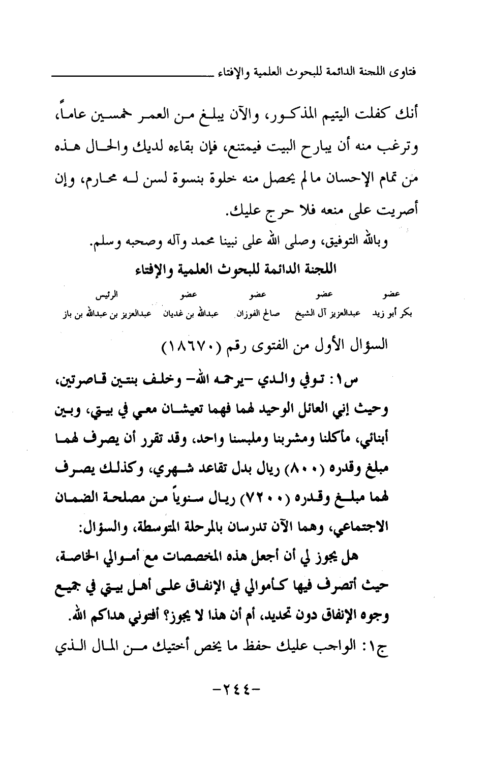 س1: توفي والدي -يرحمه الله- وخلف بنتين قاصرتين، وحيث إني العائل الوحيد لهما، فهما تعيشان معي في بيتي، وبين أبنائي، مأكلنا ومشربنا وملبسنا واحد، وقد تقرر أن يصرف لهما مبلغ وقدره (800) ريال بدل تقاعد شهري، وكذلك يصرف لهما مبلغ وقدره (7200) ريال سنويا من مصلحة الضمان الاجتماعي، وهما الآن تدرسان بالمرحلة المتوسطة. والسؤال: هل يجور لي أن أجعل هذه المخصصات مع أموالي الخاصة، حيث أتصرف فيها كأموالي في الإنفاق على أهل بيتي في جميع وجوه الإنفاق دون تحديد، أم أن هذا لا يجوز؟ أفتوني هداكم الله.
