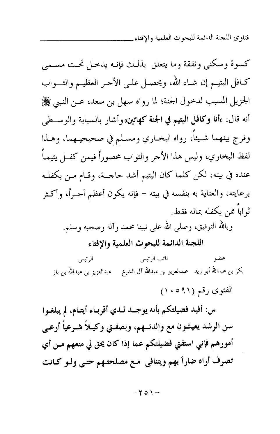 كسوة وسكنى ونفقة وما يتعلق بذلك، فإنه يدخل تحت مسمى كافل اليتيم إن شاء الله، ويحصل على الأجر العظيم والثواب الجزيل المسبب لدخول الجنة؛ لما رواه سهل بن سعد عن النبي -صلى الله عليه وسلم- أنه قال: «أنا وكافل اليتيم في الجنة كهاتين… وأشار بالسبابة والوسطى وفرج بينهما شيئا (¬1) » رواه البخاري ومسلم في صحيحيهما، وهذا لفظ البخاري وليس هذا الأجر والثواب محصورا فيمن كفل يتيما عنده في بيته، لكن كلما كان اليتيم أشد حاجة، وقام من يكفله برعايته، والعناية به بنفسه في بيته، فإنه يكون أعظم أجرا، وأكثر ثوابا ممن يكفله بماله فقط. وبالله التوفيق، وصلى الله على نبينا محمد وآله وصحبه وسلم.