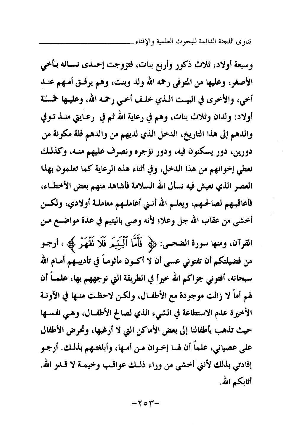 وسبعة أولاد: ثلاثة ذكور وأربع بنات، فتزوجت إحدى نسائه بأخي الأصغر، وعليها من المتوفى رحمه الله ولد وبنت، وهم برفق أمهم عند أخي، والأخرى في البيت الذي خلف أخي رحمه الله، وعليها خمسة أولاد: ولدان وثلاث بنات، وهم في رعاية الله ثم في رعايتي منذ توفي والدهم إلى هذا التاريخ، الدخل الذي لديهم من والدهم "فلة" مكونة من دورين: دور يسكنون فيه، ودور نؤجره ونصرف عليهم منه، وكذلك نعطي إخوانهم من هذا الدخل، وفي أثناء هذه الرعاية كما تعلمون بهذا العصر الذي نعيش فيه نسأل الله السلامة فأشاهد منهم بعض الأخطاء، فأعاقبهم لصالحهم، ويعلم الله أنني أعاملهم معاملة أولادي، ولكن أخشى من عقاب الله -جل وعلا-؛ لأنه وصى باليتيم في عدة مواضع من القرآن، ومنها سورة الضحى {فَأَمَّا الْيَتِيمَ فَلَا تَقْهَرْ} (¬1) أرجو من فضيلتكم أن تفتوني عسى أن لا أكون مأثوما في تأديبهم أمام الله سبحانه، أفتوني جزاكم الله خيرا في الطريقة التي نوجههم بها، علما أن لهم أما لا زالت موجودة مع الأطفال، ولكن لاحظت منها في الآونة الأخيرة عدم الاستطاعة في الشيء الذي لصالح الأطفال، وهي نفسها حيث تذهب بأطفالنا إلى بعض الأماكن التي لا أرغبها، وتحرض الأطفال على عصياني، علما أن لها إخوانا من أمها، وأبلغتهم بذلك. أرجو إفادتي بذلك لأنني أخشى من وراء ذلك عواقب وخيمة لا قدر الله. أثابكم الله.