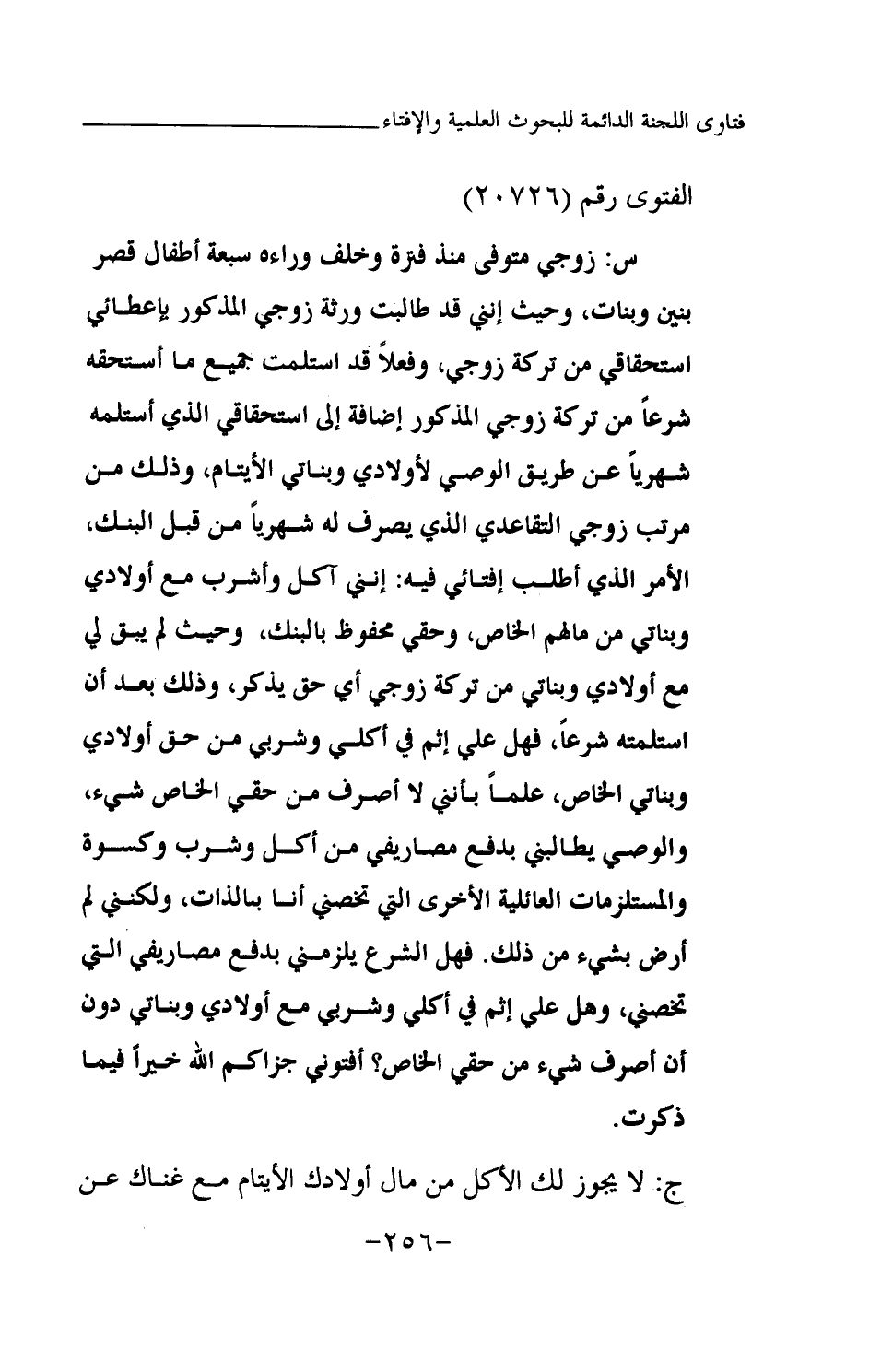 س: زوجي متوفى منذ فترة، وخلف وراءه سبعة أطفال قصر بنين وبنات، وحيث إنني قد طالبت ورثة زوجي المذكور إعطائي استحقاقي من تركة زوجي، وفعلا قد استلمت جميع ما أستحقه شرعا من تركة زوجي المذكور، إضافة إلى استحقاقي الذي أستلمه شهريا عن طريق الوصي لأولادي وبناتي الأيتام، وذلك من مرتب زوجي التقاعدي الذي يصرف له شهريا من قبل البنك. الأمر الذي أطلب إفتائي فيه: إنني آكل وأشرب مع أولادي وبناتي من مالهم الخاص، وحقي محفوظ بالبنك، وحيث لم يبق لي مع أولادي وبناتي من تركة زوجي أي حق يذكر، وذلك بعد أن استلمته شرعا، فهل علي إثم في أكلي وشربي من حق أولادي وبناتي الخاص، علما بأنني لا أصرف من حقي الخاص شيئا، والوصي يطالبني بدفع مصاريفي من أكل وشرب وكسوة والمستلزمات العائلية الأخرى التي تخصني أنا بالذات، ولكنني لم أرض بشيء من ذلك، فهل الشرع يلزمني بدفع مصاريفي التي تخصني؟ وهل علي إثم في أكلي وشربي مع أولادي وبناتي دون أن أصرف شيئا من حقي الخاص؟ أفتوني جزاكم الله خيرا فيما ذكرت.