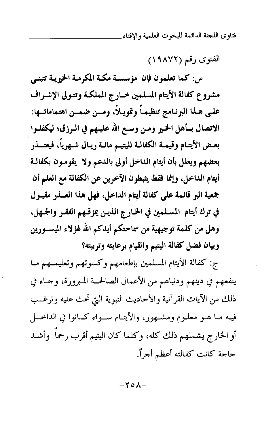 ج: كفالة الأيتام المسلمين بإطعامهم وكسوتهم وتعليمهم ما ينفعهم في دينهم ودنياهم من الأعمال الصالحة المبرورة، وجاء في ذلك من الآيات القرآنية والأحاديث النبوية التي تحث عليه وترغب فيه ما هو معلوم ومشهور، والأيتام سواء كانوا في الداخل أو الخارج يشملهم ذلك كله، وكلما كان اليتيم أقرب رحما وأشد حاجة، كانت كفالته أعظم أجرا.