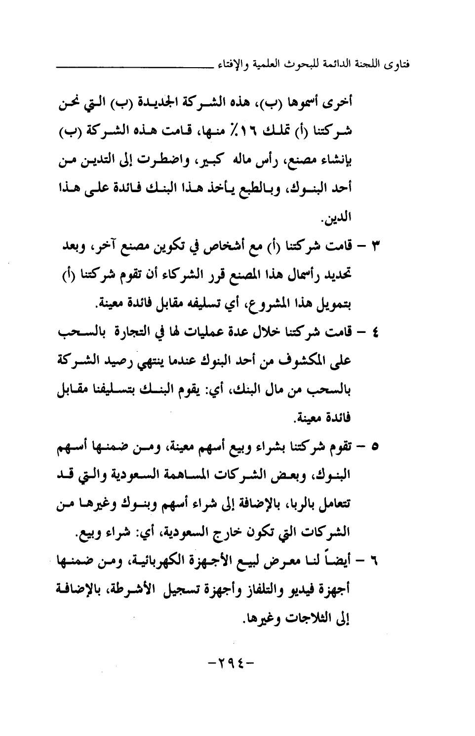 أخرى أسموها (ب) ، هذه الشركة الجديدة (ب) التي نحن شركتنا (أ) تملك 16 % منها، قامت هذه الشركة (ب) بإنشاء مصنع، رأس ماله كبير، واضطرت إلى التدين من أحد البنوك، وبالطبع يأخذ هذا البنك فائدة على هذا الدين. 3- قامت شركتنا (أ) مع أشخاص في تكوين مصنع آخر، وبعد تحديد رأسمال هذا المصنع قرر الشركاء أن تقوم شركتنا (أ) بتمويل هذا المشروع، أي تسليفه مقابل فائدة معينة. 4- قامت شركتنا خلال عدة عمليات لها في التجارة بالسحب على المكشوف من أحد البنوك عندما ينتهي رصيد الشركة بالسحب من مال البنك، أي: يقوم البنك بتسليفنا مقابل فائدة معينة. 5- تقوم شركتنا بشراء وبيع أسهم معينة، ومن ضمنها أسهم البنوك، وبعض الشركات المساهمة السعودية والتي قد تتعامل بالربا، بالإضافة إلى شراء أسهم وبنوك وغيرها من الشركات التي تكون خارج السعودية أي: شراء وبيع. 6- أيضا لنا معرض لبيع الأجهزة الكهربائية، ومن ضمنها أجهزة فيديو والتلفاز وأجهزة تسجيل الأشرطة، بالإضافة إلى الثلاجات وغيرها.