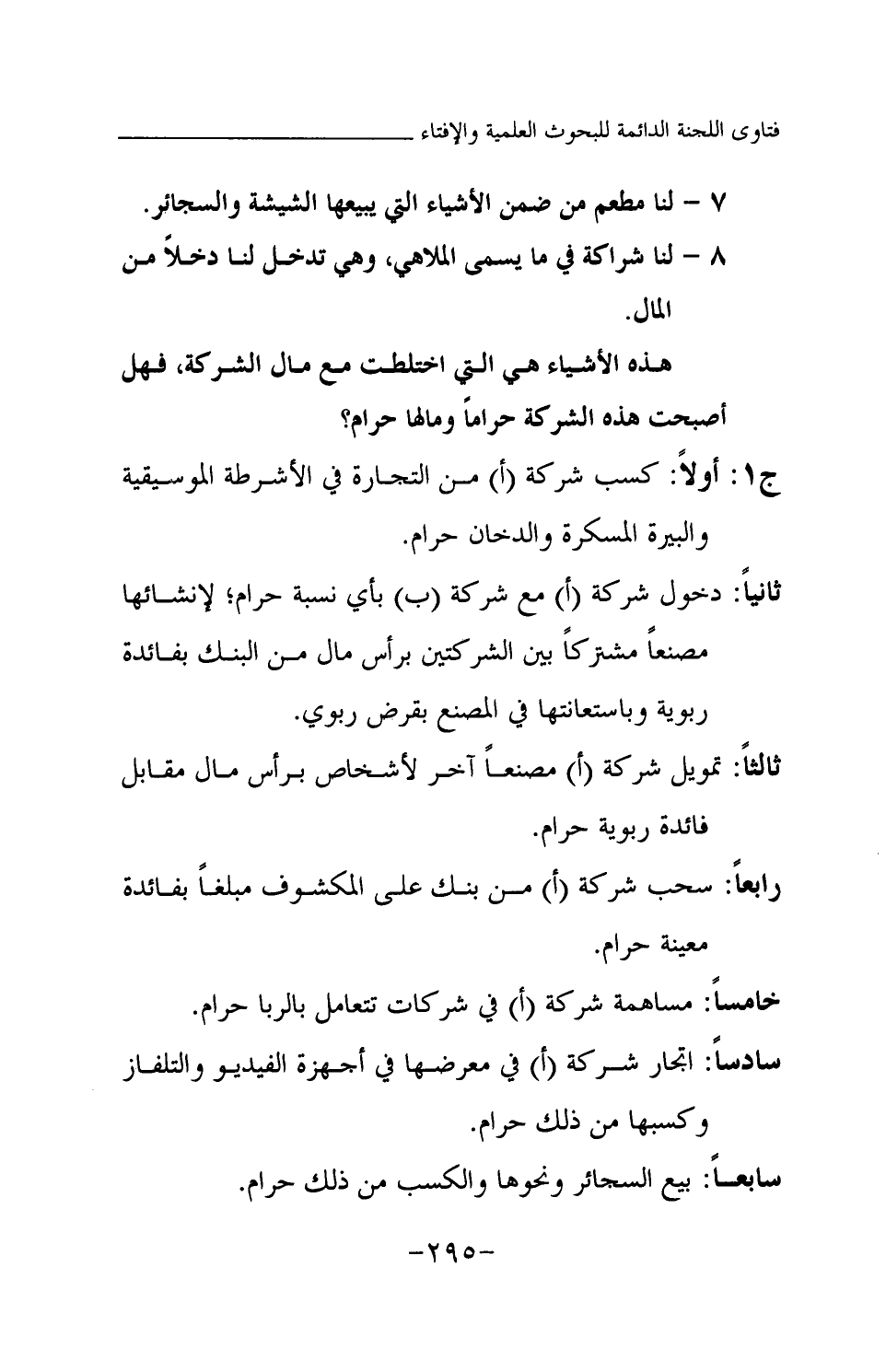 ج أ: أولا: كسب شركة (أ) من التجارة في الأشرطة الموسيقية والبيرة المسكرة والدخان حرام. ثانيا: دخول شركة (أ) مع شركة (ب) بأي نسبة حرام؛ لإنشائها مصنعا مشتركا بين الشركتين برأس مال من البنك بفائدة ربوية وباستعانتها في المصنع بقرض ربوي. ثالثا: تمويل شركة (أ) مصنعا آخر لأشخاص برأس مال مقابل فائدة ربوية حرام. رابعا: سحب شركة (أ) من بنك على المكشوف مبلغا بفائدة معينة حرام. خامسا: مساهمة شركة (أ) في شركات تتعامل بالربا حرام. سادسا: اتجار شركة (أ) في معرضها في أجهزة الفيديو والتلفاز وكسبها من ذلك حرام. سابعا: بيع السجائر ونحوها والكسب من ذلك حرام.