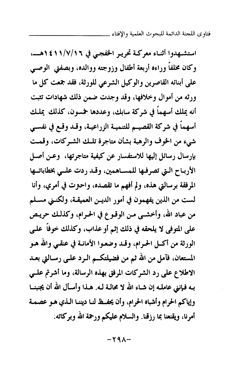 استشهدوا أثناء معركة تحرير الخفجي في 16 \ 7 \ 1411هـ، وكان مخلفا وراءه أربعة أطفال وزوجته ووالده، وبصفتي الوصي على أبنائه القاصرين والوكيل الشرعي للورثة، فقد جمعت كل ما ورثه من أموال وخلافها، وقد وجدت ضمن ذلك شهادات تثبت أنه يملك أسهما في شركة سابك، وعددها خمسون، كذلك يملك أسهما في شركة القصيم للتنمية الزراعية، وقد وقع في نفسي شيء من الخوف والرهبة بشأن متاجرة تلك الشركات، وقمت بإرسال رسائل إليها للاستفسار عن كيفية متاجرتها، وعن أصل الأرباح التي تصرفها للمساهمين، وقد ردت علي بخطاباتها المرفقة برسالتي هذه، ولم أفهم ما تقصده، واحترت في أمري، وأنا لست من الذين يفهمون في أمور الدين العميقة، ولكنني مسلم من عباد الله، وأخشى من الوقوع في الحرام، وكذلك حريص على المتوفى لا يلحقه في ذلك إثم أو عذاب، وكذلك خوفا على الورثة من أكل الحرام، وقد وضعوا الأمانة في عنقي والله هو المستعان، فآمل من الله ثم من فضيلتكم الرد على رسالتي بعد الاطلاع على رد الشركات المرفق بهذه الرسالة، وما أشرتم علي به فإنني عامله إن شاء الله لا محالة له. هذا وأسأل الله أن يجنبنا وإياكم الحرام وأشباه الحرام، وأن يحفظ لنا ديننا الذي هو عصمة أمرنا، ويقنعنا بما رزقنا. والسلام عليكم ورحمة الله وبركاته.