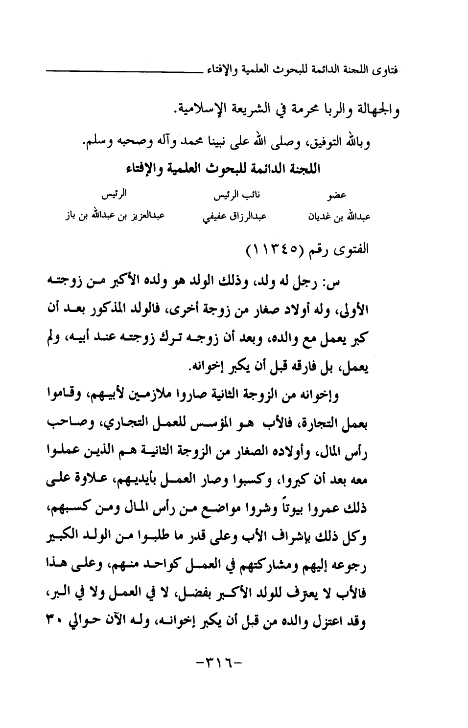 س: رجل له ولد، وذلك الولد هو ولده الأكبر من زوجته الأولى، وله أولاد صغار من زوجة أخرى، فالولد المذكور بعد أن كبر يعمل مع والده، وبعد أن زوجه ترك زوجته عند أبيه، ولم يعمل، بل فارقه قبل أن يكبر إخوانه. وإخوانه من الزوجة الثانية صاروا ملازمين لأبيهم، وقاموا بعمل التجارة، فالأب هو المؤسس للعمل التجاري، وصاحب رأس المال، وأولاده الصغار من الزوجة الثانية هم الذين عملوا معه بعد أن كبروا، وكسبوا وصار العمل بأيديهم، علاوة على ذلك عمروا بيوتا وشروا مواضع من رأس المال ومن كسبهم، وكل ذلك بإشراف الأب وعلى قدر ما طلبوا من الولد الكبير رجوعه إليهم ومشاركتهم في العمل كواحد منهم، وعلى هذا فالأب لا يعرف للولد الأكبر بفضل، لا في العمل ولا في البر، وقد اعتزل والده من قبل أن يكبر إخوانه، وله الآن حوالي 30