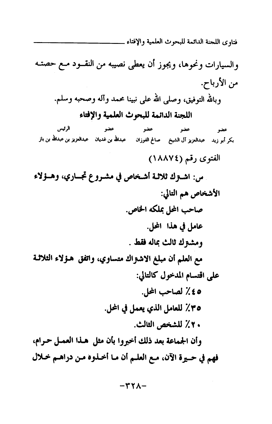 س: اشترك ثلاثة أشخاص في مشروع تجاري، وهؤلاء الأشخاص هم التالي: صاحب المحل بملكه الخاص. عامل في هذا المحل. ومشترك ثالث بماله فقط. مع العلم أن مبلغ الاشتراك متساو، واتفق هؤلاء الثلاثة على اقتسام المدخول كالتالي: 45 % لصاحب المحل. 35 % للعامل الذي يعمل في المحل. 20 % للشخص الثالث. وأن الجماعة بعد ذلك أخبروا بأن مثل هذا العمل حرام، فهم في حيرة الآن، مع العلم أن ما أخذوه من دراهم خلال