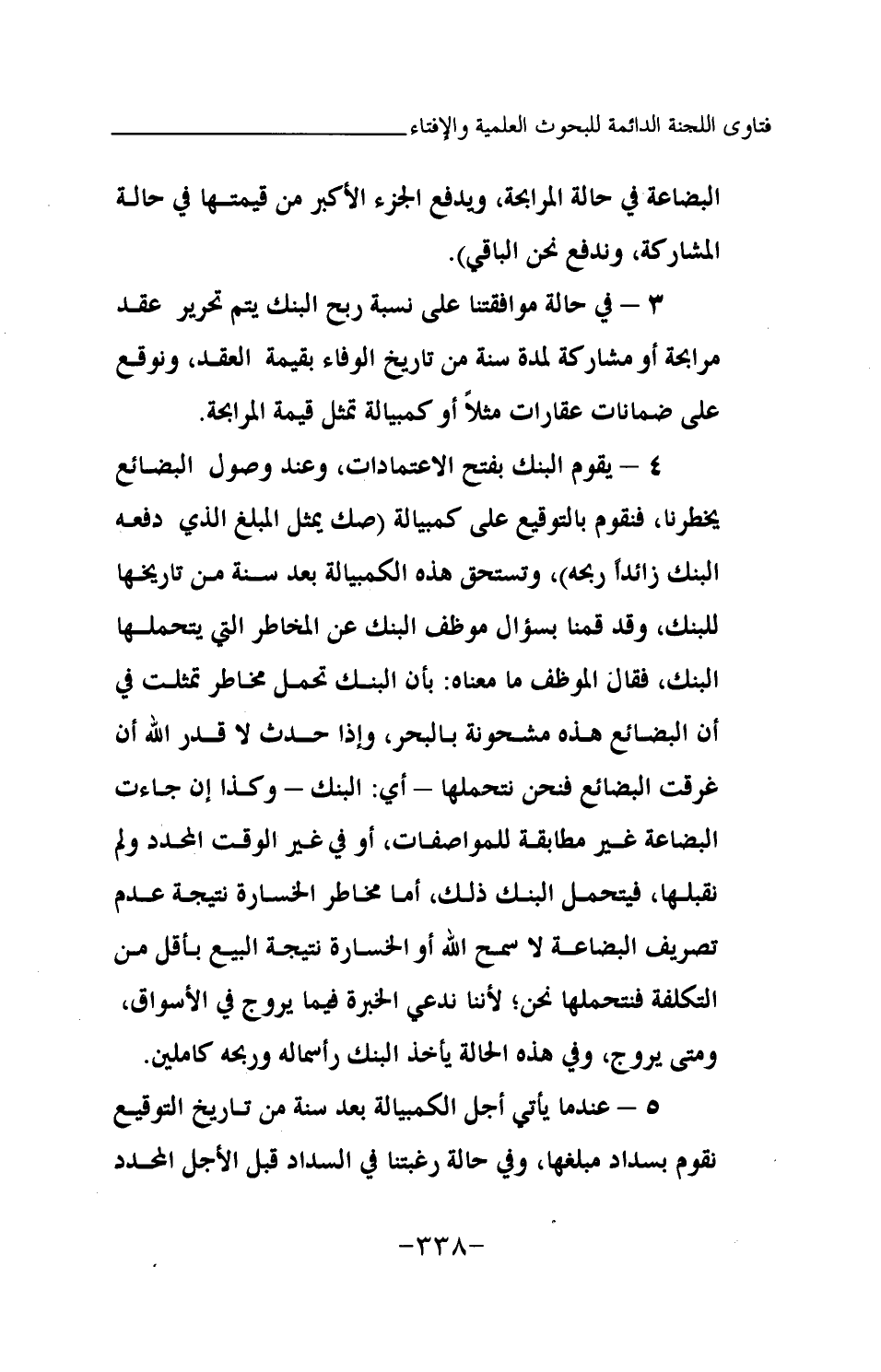البضاعة في حالة المرابحة، ويدفع الجزء الأكبر من قيمتها في حالة المشاركة، وندفع نحن الباقي) . 3- في حالة موافقتنا على نسبة ربح البنك يتم تحرير عقد مرابحة أو مشاركة لمدة سنة من تاريخ الوفاء بقيمة العقد، ونوقع على ضمانات عقارات مثلا أو كمبيالة تمثل قيمة المرابحة. 4- يقوم البنك بفتح الاعتمادات، وعند وصول البضائع يخطرنا، فنقوم بالتوقيع على كمبيالة (صك يمثل المبلغ الذي دفعه البنك زائدا ربحه) ، وتستحق هذه الكمبيالة بعد سنة من تاريخها للبنك، وقد قمنا بسؤال موظف البنك عن المخاطر التي يتحملها البنك، فقال الموظف ما معناه: بأن البنك تحمل مخاطر تمثلت في أن البضائع هذه مشحونة بالبحر، وإذا حدث لا قدر الله أن غرقت البضائع فنحن نتحملها- أي: البنك- وكذا إن جاءت البضاعة غير مطابقة للمواصفات، أو في غير الوقت المحدد ولم نقبلها، فيتحمل البنك ذلك، أما مخاطر الخسارة نتيجة عدم تصريف البضاعة لا سمح الله أو الخسارة نتيجة البيع بأقل من التكلفة فنتحملها نحن؛ لأننا ندعي الخبرة فيما يروج في الأسواق، ومتى يروج، وفي هذه الحالة يأخذ البنك رأس ماله وربحه كاملين. 5- عندما يأتي أجل الكمبيالة بعد سنة من تاريخ التوقيع نقوم بسداد مبلغها، وفي حالة رغبتنا في السداد قبل الأجل المحدد