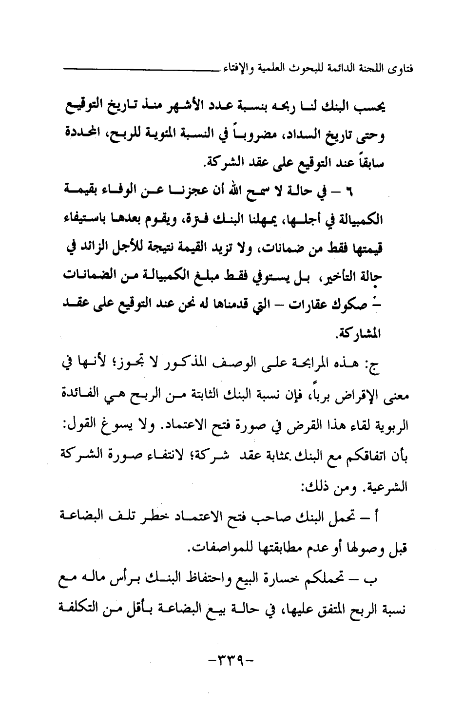ج: هذه المرابحة على الوصف المذكور لا تجوز؛ لأنها في معنى الإقراض بربا، فإن نسبة البنك الثابتة من الربح هي الفائدة الربوية لقاء هذا القرض في صورة فتح الاعتماد. ولا يسوغ القول: بأن اتفاقكم مع البنك. بمثابة عقد شركة، لانتفاء صورة الشركة الشرعية. ومن ذلك: أ- تحمل البنك صاحب فتح الاعتماد خطر تلف البضاعة قبل وصولها أو عدم مطابقتها للمواصفات. ب- تحملكم خسارة البيع واحتفاظ البنك برأس ماله مع نسبة الربح المتفق عليها، في حالة بيع البضاعة بأقل من التكلفة