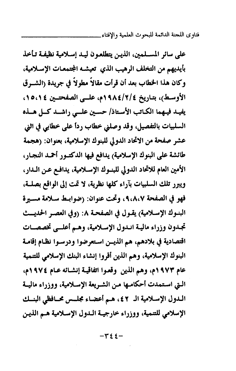 على سائر المسلمين، الذين يتطلعون ليد إسلامية نظيفة تأخذ بأيديهم من التخلف الرهيب الذي تعيشه المجتمعات الإسلامية، وكان هذا الخطاب بعد أن قرأت مقالا مطولا في جريدة (الشرق الأوسط) ، بتاريخ 4 \ 3 \ 1984م، على الصفحتين 14، 15، يفيد فيهما الكاتب الأستاذ \ حسين علي راشد كل هذه السلبيات بالتفصيل. وقد وصلني خطاب ردا على خطابي في اثني عشر صفحة من الاتحاد الدولي للبنوك الإسلامية، بعنوان: (هجمة طائشة على البنوك الإسلامية) يدافع فيها الدكتور أحمد النجار الأمين العام للاتحاد الدولي للبنوك الإسلامية، يدافع عن الدار، ويبرر تلك السلبيات بآراء كلها نظرية، لا تمت إلى الواقع بصلة، فهو في الصفحة 7، 8، 9، وتحت عنوان: (ضوابط سلامة مسيرة البنوك الإسلامية) ، يقول في الصفحة 8: (وفي العصر الحديث تجدون وزراء مالية الدول الإسلامية، وهم أعلى تخصصات اقتصادية في بلادهم، هم الذين استعرضوا ودرسوا نظام إقامة البنوك الإسلامية، وهم الذين أقروا إنشاء البنك الإسلامي للتنمية عام 1973م، وهم الذين وقعوا اتفاقية إنشائه عام 1974م، التي استمدت أحكامها من الشريعة الإسلامية، ووزراء مالية الدول الإسلامية الـ 42، هم أعضاء مجلس محافظي البنك الإسلامي للتنمية، ووزراء خارجية الدول الإسلامية هم الذين