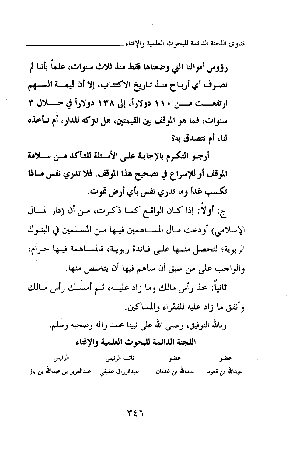 رؤوس أموالنا التي وضعناها فقط منذ ثلاث سنوات؛ علما بأننا لم نصرف أي أرباح منذ تاريخ الاكتتاب، إلا أن قيمة السهم ارتفعت من 110 دولارا، إلى 138 دولارا في خلال 3 سنوات، فما هو الموقف بين القيمتين، هل نتركه للدار، أم نأخذه لنا، أم نتصدق به؟ أرجو التكرم بالإجابة على الأسئلة؛ للتأكد من سلامة الموقف، أو للإسراع في تصحيح هذا الموقف؛ فلا تدري نفس ماذا تكسب غدا {وَمَا تَدْرِي نَفْسٌ بِأَيِّ أَرْضٍ تَمُوتُ} (¬1)