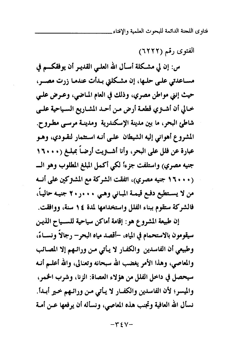 س: إن لي مشكلة، أسأل الله العلي القدير أن يوفقكم في مساعدتي على حلها، إن مشكلتي بدأت عندما زرت مصر حيث إنني مواطن مصري، وذلك في العام الماضي، وعرض علي خالي أن أشتري قطعة أرض من أحد المشاريع السياحية على شاطئ البحر، ما بين مدينة الإسكندرية ومدينة مرسى مطروح المشروع أهواني إليه الشيطان على أنه استثمار لنقودي، وهو عبارة عن فلل على البحر، وأنا اشتريت أرضا بمبلغ (16000 جنيه مصري) واستلفت جزءا لكي أكمل المبلغ المطلوب وهو الـ (16000 جنيه مصري) ، اتفقت الشركة مع المشتركين على أنه من لا يستطيع دفع قيمة المباني، وهي 20000 جنيه حاليا، فالشركة ستقوم ببناء الفلل واستخدامها لمدة 14 سنة، ووافقت. إن طبيعة المشروع هو: إقامة أماكن سياحية للسياح الذين سيقومون بالاستحمام في المياه، - أقصد مياه البحر- رجالا ونساء، وطبيعي أن الفاسدين والكفار لا يأتي من ورائهم إلا المصائب والمعاصي، وهذا الأمر يغضب الله -سبحانه وتعالى- والله أعلم أنه سيحصل في داخل الفلل من هؤلاء العصاة: الزنا، وشرب الخمر، والميسر؛ لأن الفاسدين والكفار لا يأتي من ورائهم خير أبدأ. نسأل الله العافية وتجنب هذه المعاصي، ونسأله أن يرفعها عن أمة