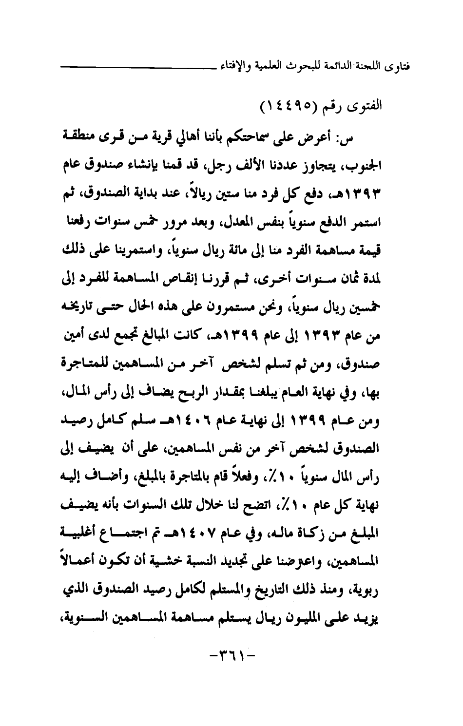 س: أعرض على سماحتكم بأننا أهالي قرية من قرى منطقة الجنوب، يتجاوز عددنا الألف رجل، قد قمنا بإنشاء صندوق عام 1393هـ، دفع كل فرد منا ستين ريالا، عند بداية الصندوق، ثم استمر الدفع سنويا بنفس المعدل، وبعد مرور خمس سنوات رفعنا قيمة مساهمة الفرد منا إلى مائة ريال سنويا، واستمررنا على ذلك لمدة ثمان سنوات أخرى، ثم قررنا إنقاص المساهمة للفرد إلى خمسين ريال سنويا، ونحن مستمرون على هذه الحال حتى تاريخه من عام 1393 إلى عام 1399هـ. كانت المبالغ تجمع لدى أمين صندوق، ومن ثم تسلم لشخص آخر من المساهمين للمتاجرة بها، وفي نهاية العام يبلغنا بمقدار الربح يضاف إلى رأس المال، ومن عام 1399 إلى نهاية عام 1406هـ سلم كامل رصيد الصندوق لشخص آخر من نفس المساهمين، على أن يضيف إلى رأس المال سنويا 10 %، وفعلا قام بالمتاجرة بالمبلغ، وأضاف إليه نهاية كل عام 10 %، اتضح لنا -خلال تلك السنوات- بأنه يضيف المبلغ من زكاة ماله. وفي عام 1407 هـ تم اجتماع أغلبية المساهمين، واعترضنا على تحديد النسبة خشية أن تكون أعمالا ربوية، ومنذ ذلك التاريخ والمستلم لكامل رصيد الصندوق -الذي يزيد على المليون ريال- يستلم مساهمة المساهمين السنوية،