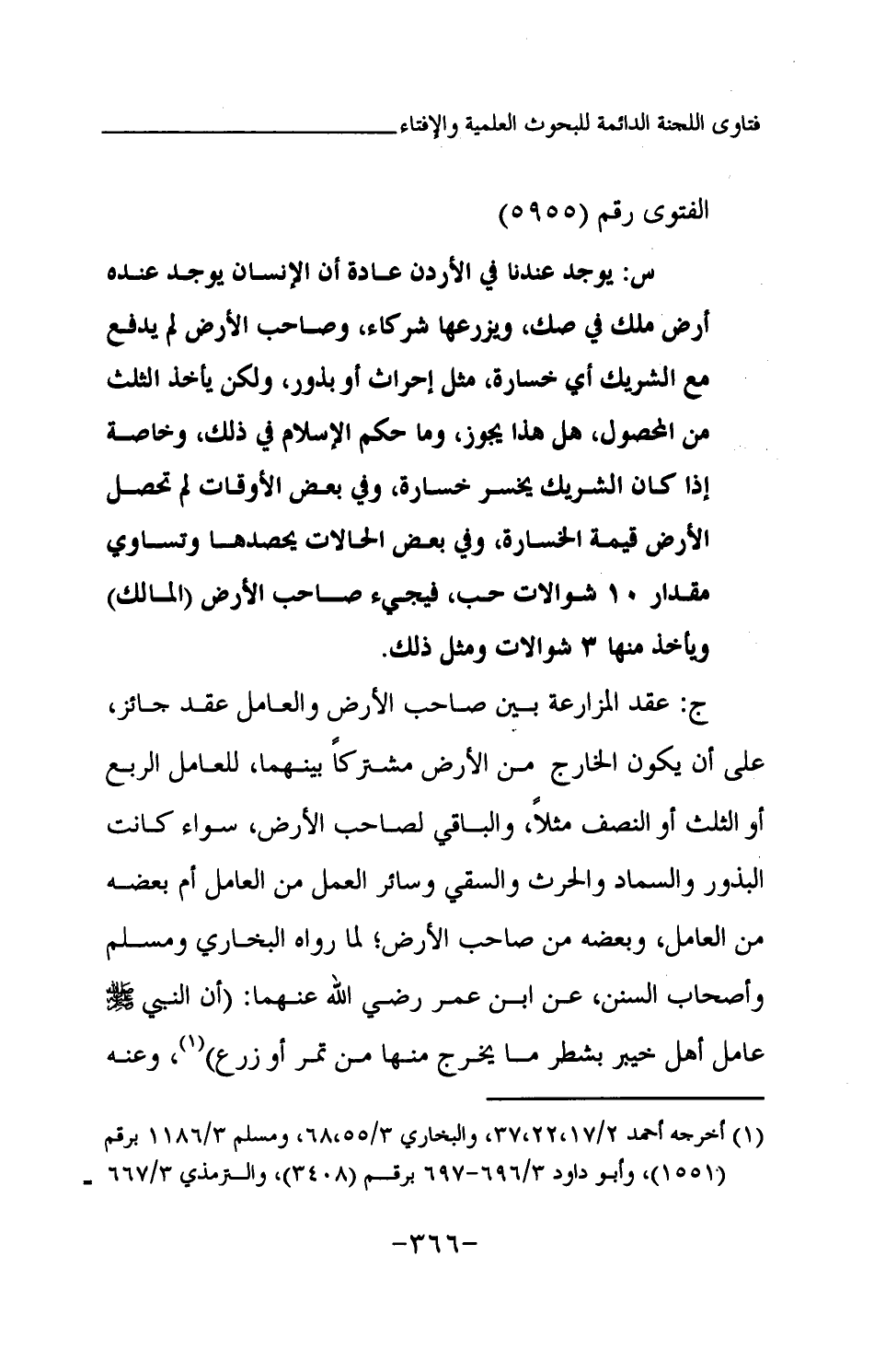 ج: عقد المزارعة بين صاحب الأرض والعامل عقد جائز، على أن يكون الخارج من الأرض مشتركا بينهما، للعامل الربع أو الثلث أو النصف مثلا، والباقي لصاحب الأرض، سواء كانت البذور والسماد والحرث والسقي وسائر العمل من العامل، أم بعضه من العامل وبعضه من صاحب الأرض؛ لما رواه البخاري ومسلم وأصحاب السنن عن ابن عمر -رضي الله عنهما-: «أن النبي -صلى الله عليه وسلم- عامل أهل خيبر بشطر ما يخرج منها من تمر أو زرع (¬1) » وعنه