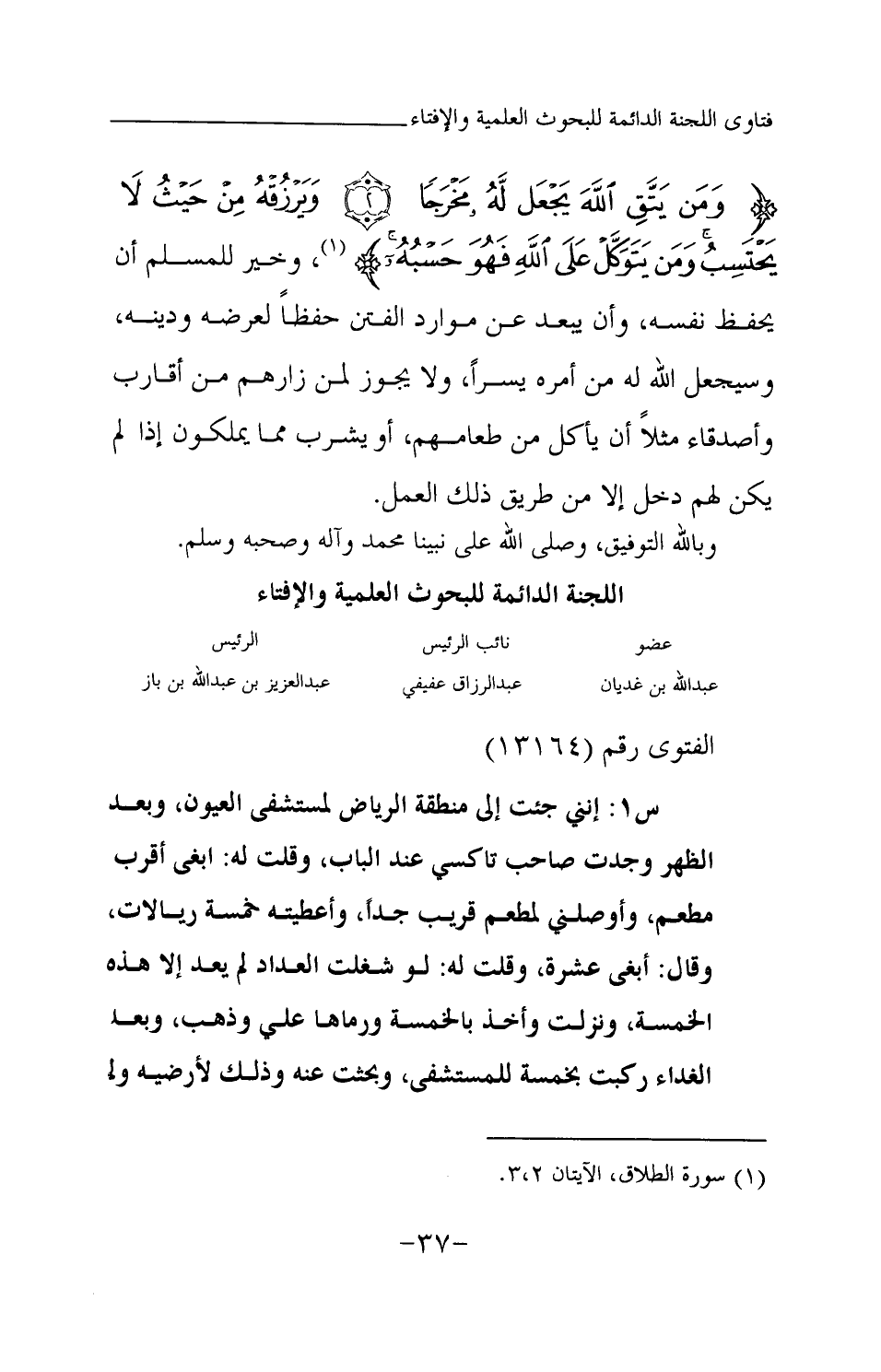 {وَمَنْ يَتَّقِ اللَّهَ يَجْعَلْ لَهُ مَخْرَجًا} (¬1) {وَيَرْزُقْهُ مِنْ حَيْثُ لَا يَحْتَسِبُ وَمَنْ يَتَوَكَّلْ عَلَى اللَّهِ فَهُوَ حَسْبُهُ} (¬2) وخير للمسلم أن يحفظ نفسه، وأن يبعد عن موارد الفتن حفظا لعرضه ودينه، وسيجعل الله له من أمره يسرا، ولا يجوز لمن زارهم من أقارب وأصدقاء مثلا أن يأكل من طعامهم، أو يشرب مما يملكون إذا لم يكن لهم دخل إلا من طريق ذلك العمل. وبالله التوفيق، وصلى الله على نبينا محمد وآله وصحبه وسلم.