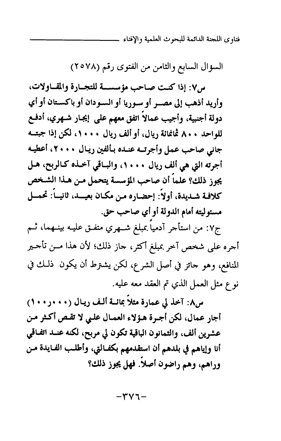 س 7: إذا كنت صاحب مؤسسة للتجارة والمقاولات، وأريد أذهب إلى مصر أو سوريا أو السودان أو باكستان أو أي دولة أجنبية، وأجيب عمالا اتفق معهم على إيجار شهري، أدفع للواحد 800 ثمانمائة ريال، أو ألف ريال 1000، لكن إذا جبته جاني صاحب عمل وأجرته عنده بألفين ريال 2000، أعطيه أجرته التي هي ألف ريال 1000، والباقي آخذه كالربح، هل يجوز ذلك؟ علما أن صاحب المؤسسة يتحمل من هذا الشخص كلافة شديدة، أولا: إحضاره من مكان بعيد، ثانيا: تحمل مسئوليته أمام الدولة أو أي صاحب حق.