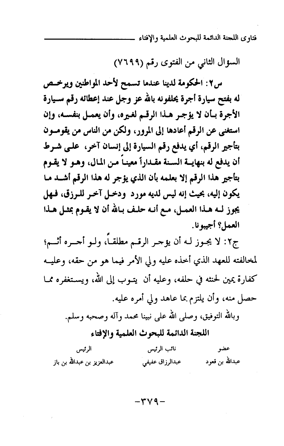 ج2: لا يجوز له أن يؤجر الرقم مطلقا، ولو أجره أثم؛ لمخالفته للعهد الذي أخذه عليه ولي الأمر فيما هو من حقه، وعليه كفارة يمين لحنثه في حلفه، وعليه أن يتوب إلى الله، ويستغفره مما حصل منه، وأن يلتزم بما عاهد ولي أمره عليه. وبالله التوفيق، وصلى الله على نبينا محمد وآله وصحبه وسلم.