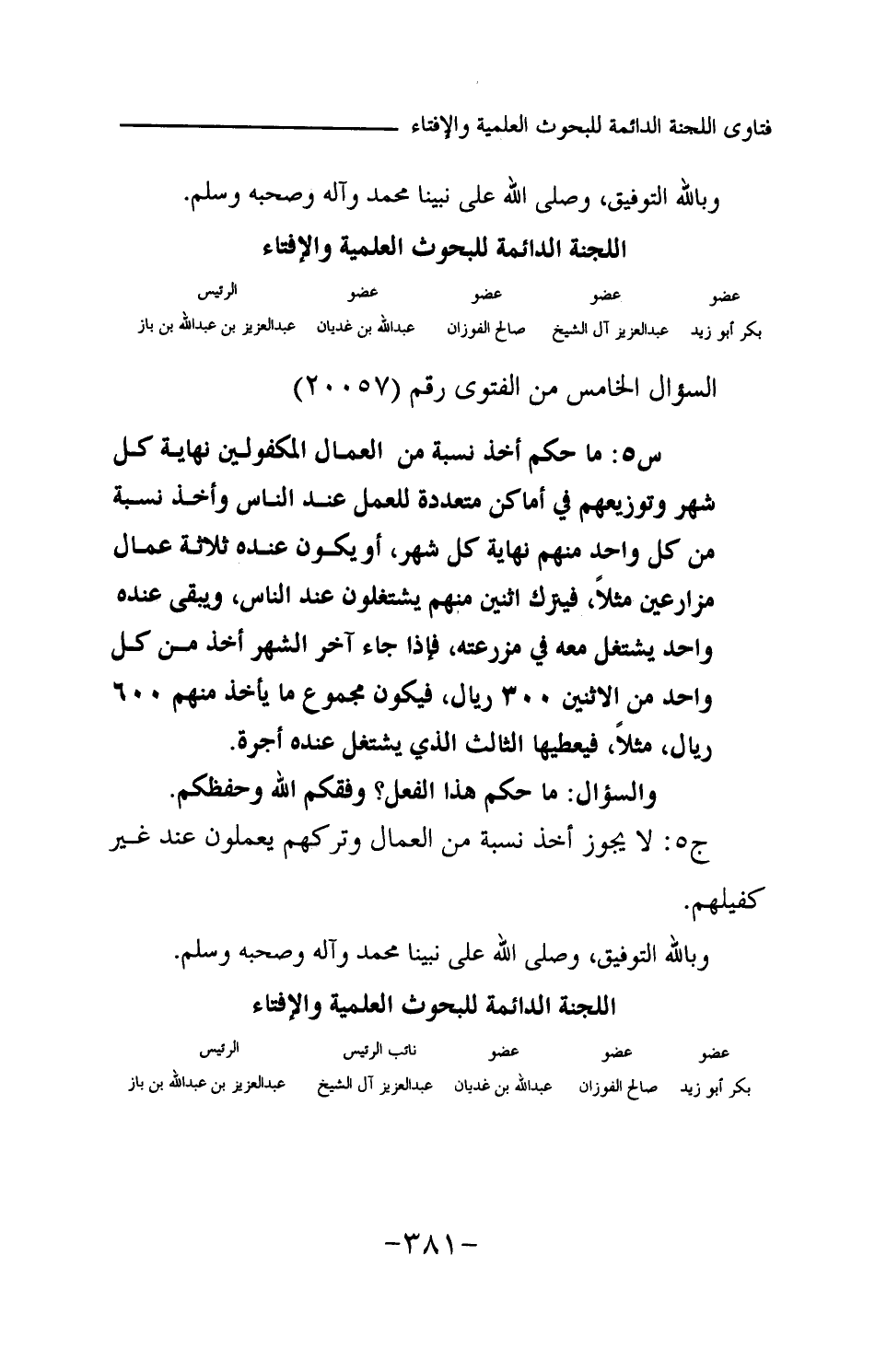 ج5: لا يجوز أخذ نسبة من العمال وتركهم يعملون عند غير كفيلهم. وبالله التوفيق، وصلى الله على نبينا محمد وآله وصحبه وسلم.