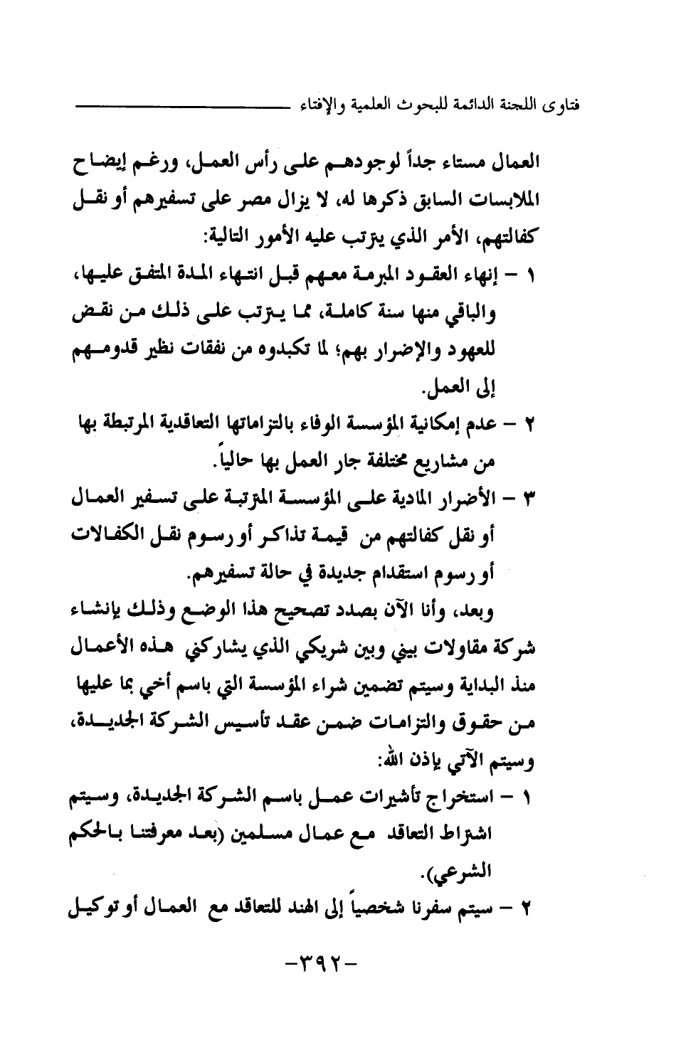 العمال مستاء جدا لوجودهم على رأس العمل، ورغم إيضاح الملابسات السابق ذكرها له، لا يزال مصرا على تسفيرهم أو نقل كفالتهم، الأمر الذي يترتب عليه الأمور التالية: 1- إنهاء العقود المبرمة معهم قبل انتهاء المدة المتفق عليها، والباقي منها سنة كاملة، مما يترتب على ذلك من نقض للعهود والإضرار بهم؛ لما تكبدوه من نفقات نظير قدومهم إلى العمل. 2- عدم إمكانية المؤسسة الوفاء بالتزاماتها التعاقدية المرتبطة بها من مشاريع مختلفة جار العمل بها حاليا. 3- الأضرار المادية على المؤسسة المترتبة على تسفير العمال أو نقل كفالتهم من قيمة تذاكر أو رسوم نقل الكفالات أو رسوم استقدام جديدة في حالة تسفيرهم. وبعد، وأنا الآن بصدد تصحيح هذا الوضع وذلك بإنشاء شركة مقاولات بيني وبين شريكي الذي يشاركني هذه الأعمال منذ البداية وسيتم تضمين شراء المؤسسة التي باسم أخي بما عليها من حقوق والتزامات ضمن عقد تأسيس الشركة الجديدة، وسيتم الآتي بإذن الله: 1- استخراج تأشيرات عمل باسم الشركة الجديدة، وسيتم اشتراط التعاقد مع عمال مسلمين (بعد معرفتنا بالحكم الشرعي) . 2- سيتم سفرنا شخصيا إلى الهند للتعاقد مع العمال أو توكيل