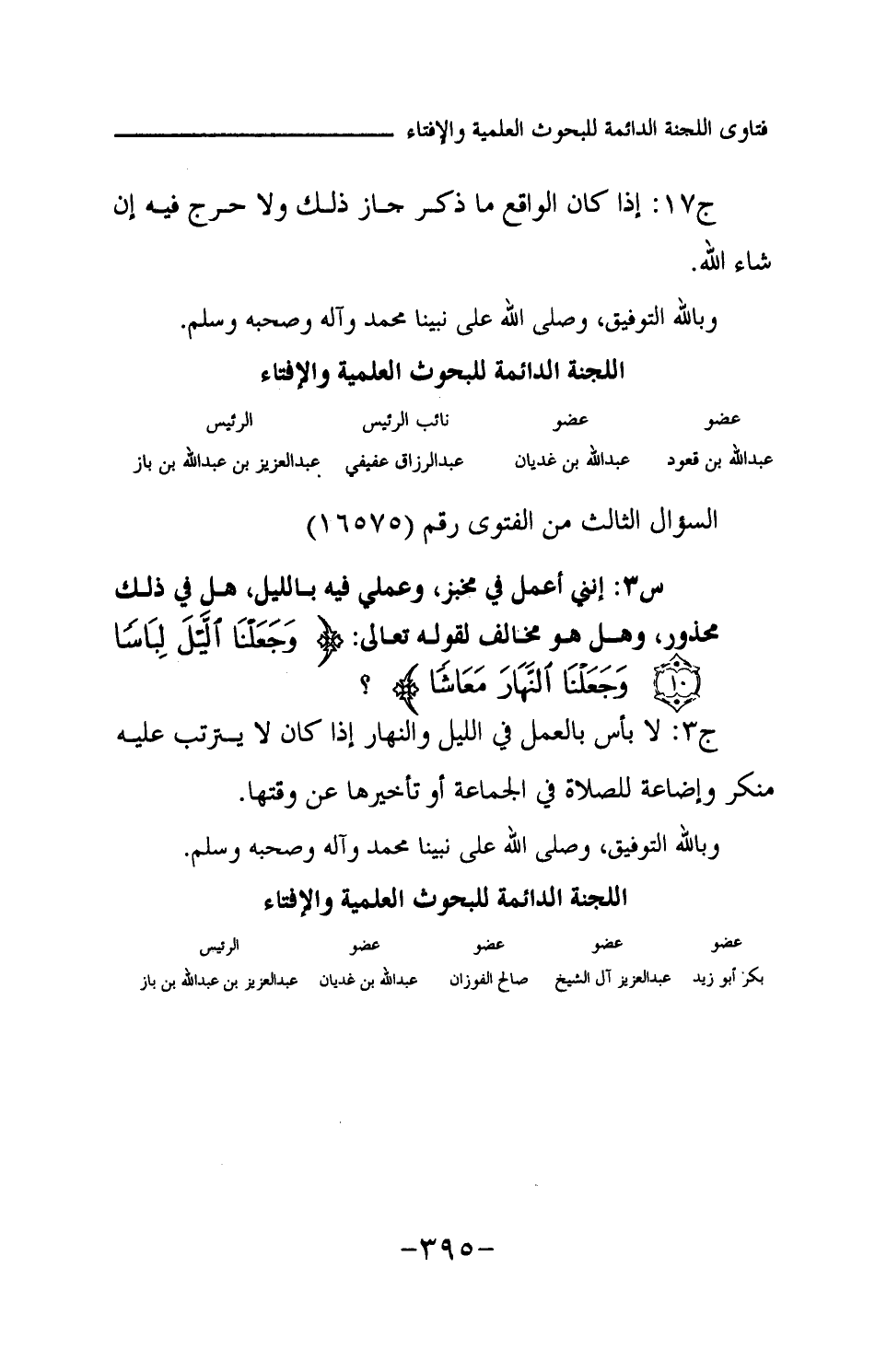 س3: إنني أعمل في مخبز، وعملي فيه بالليل، هل في ذلك محذور، وهل هو مخالف لقوله تعالى: {وَجَعَلْنَا اللَّيْلَ لِبَاسًا} (¬1) {وَجَعَلْنَا النَّهَارَ مَعَاشًا} (¬2) ؟