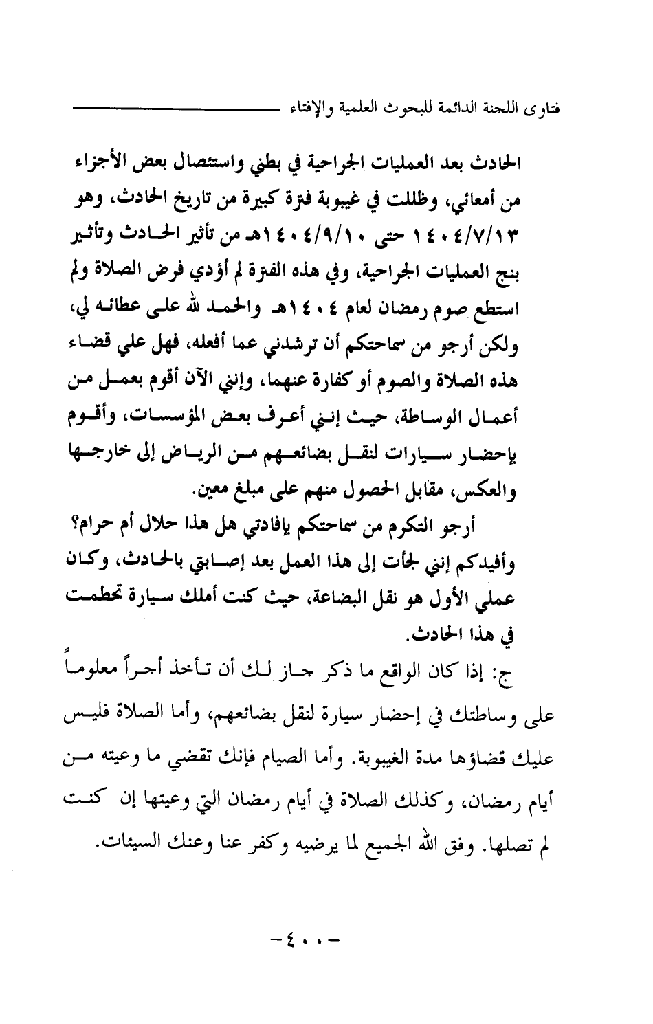 الحادث بعد العمليات الجراحية في بطني واستئصال بعض الأجزاء من أمعائي، وظللت في غيبوبة فترة كبيرة من تاريخ الحادث، وهو 13 \ 7 \ 1404 حتى 10 \ 9 \ 1404 هـ من تأثير الحادث وتأثير بنج العمليات الجراحية، وفي هذه الفترة لم أؤد فرض الصلاة ولم أستطع صوم رمضان لعام 1404هـ والحمد لله على عطائه لي، ولكن أرجو من سماحتكم أن ترشدني عما أفعله، فهل علي قضاء هذه الصلاة والصوم أو كفارة عنهما، وإنني الآن أقوم بعمل من أعمال الوساطة، حيث إنني أعرف بعض المؤسسات، وأقوم بإحضار سيارات لنقل بضائعهم من الرياض إلى خارجها والعكس، مقابل الحصول منهم على مبلغ معين. أرجو التكرم من سماحتكم بإفادتي هل هذا حلال أم حرام؟ وأفيدكم أنني لجأت إلى هذا العمل بعد إصابتي بالحادث، وكان عملي الأول هو نقل البضاعة، حيث كنت أملك سيارة تحطمت في هذا الحادث.