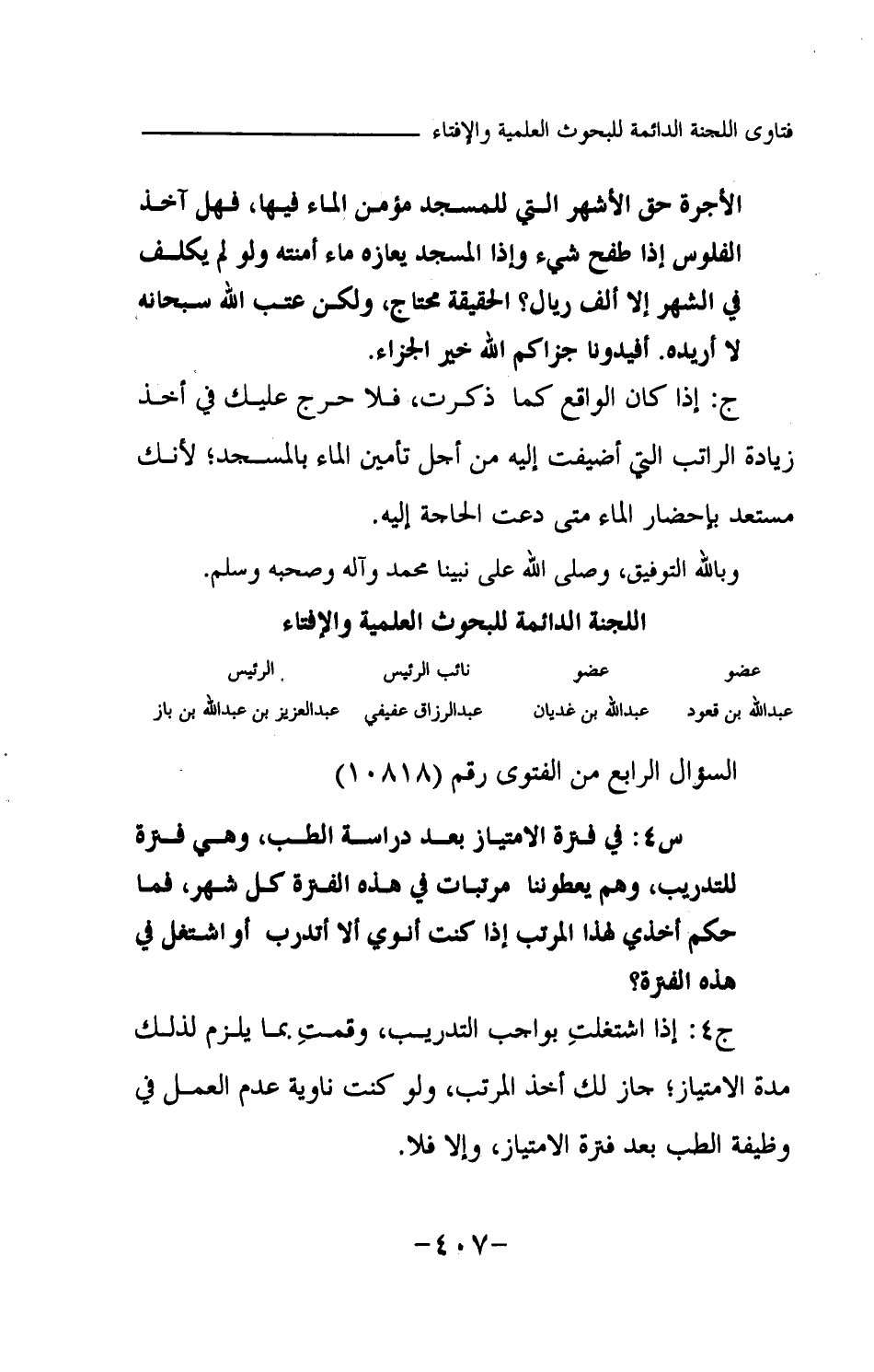 ج: إذا كان الواقع كما ذكرت، فلا حرج عليك في أخذ زيادة الراتب التي أضيفت إليه من أجل تأمين الماء بالمسجد؛ لأنك مستعد بإحضار الماء متى دعت الحاجة إليه. وبالله التوفيق، وصلى الله على نبينا محمد وآله وصحبه وسلم.