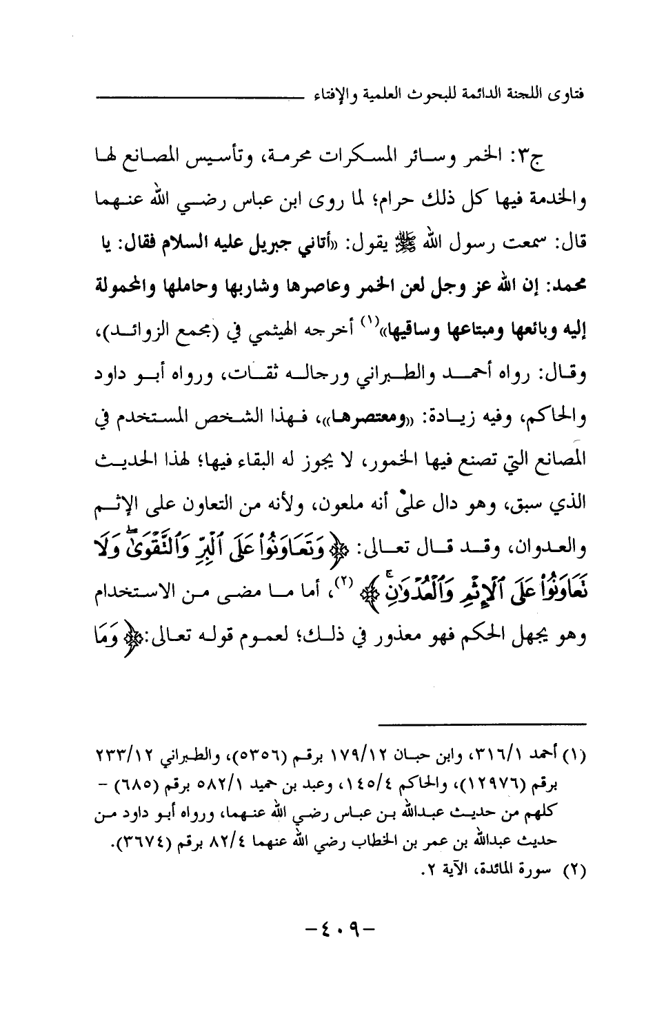 ج3: الخمر وسائر المسكرات محرمة، وتأسيس المصانع لها والخدمة فيها كل ذلك حرام؛ لما روى ابن عباس رضي الله عنهما قال: سمعت رسول الله -صلى الله عليه وسلم- يقول: «أتاني جبريل عليه السلام فقال: يا محمد إن الله عز وجل لعن الخمر وعاصرها وشاربها وحاملها والمحمولة إليه وبائعها ومبتاعها وساقيها (¬1) » أخرجه الهيثمي في (مجمع الزوائد) ، وقال: رواه أحمد والطبراني ورجاله ثقات، ورواه أبو داود والحاكم وفيه زيادة: " ومعتصرها "، فهذا الشخص المستخدم في المصانع التي تصنع فيها الخمور، لا يجوز له البقاء فيها؛ لهذا الحديث الذي سبق، وهو دال على أنه ملعون، ولأنه من التعاون على الإثم والعدوان، وقد قال تعالى: {وَتَعَاوَنُوا عَلَى الْبِرِّ وَالتَّقْوَى وَلَا تَعَاوَنُوا عَلَى الْإِثْمِ وَالْعُدْوَانِ} (¬2) أما ما مضى من الاستخدام وهو يجهل الحكم فهو معذور في ذلك؛ لعموم قوله تعالى: