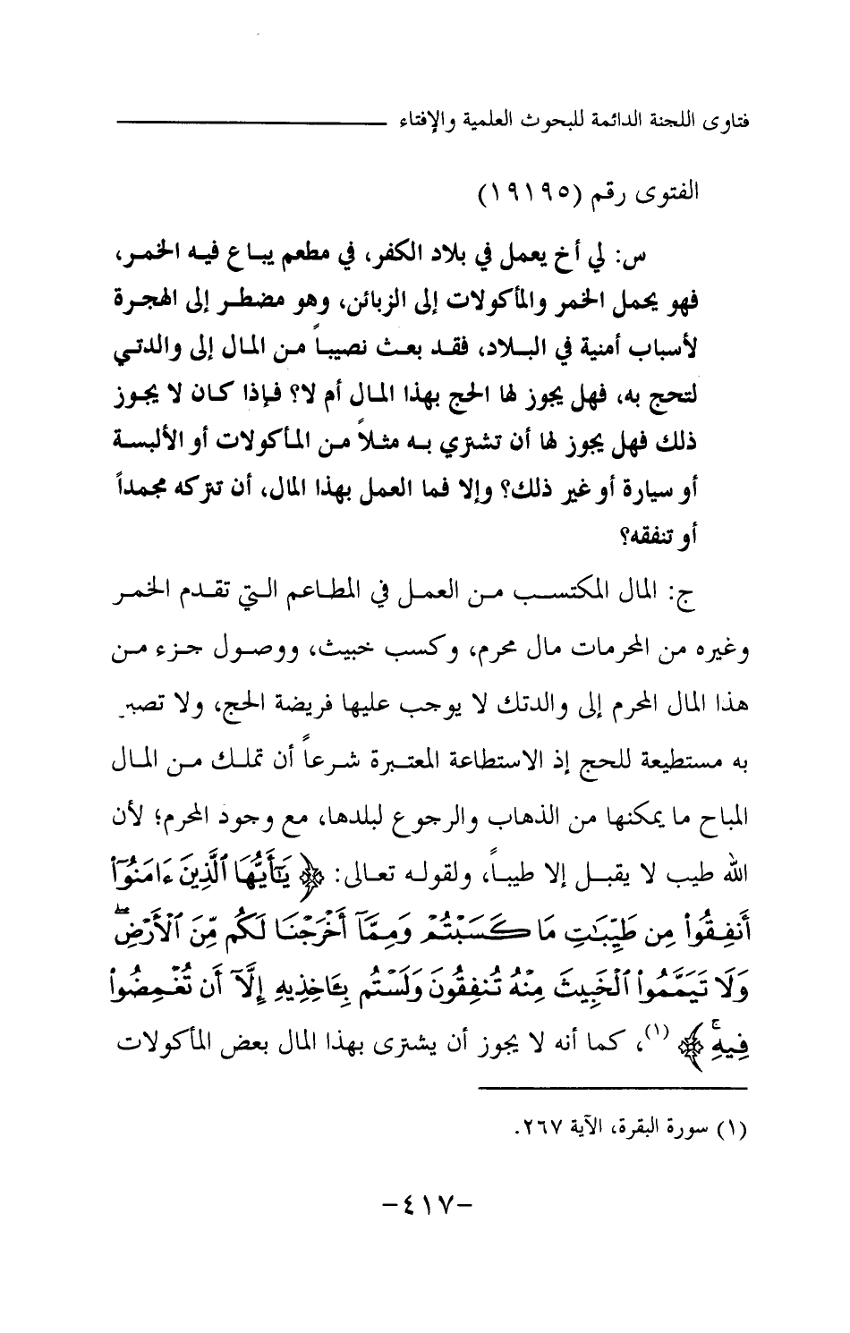 ج: المال المكتسب من العمل في المطاعم التي تقدم الخمر وغيره من المحرمات مال محرم، وكسب خبيث، ووصول جزء من هذا المال المحرم إلى والدتك لا يوجب عليها فريضة الحج، ولا تصير به مستطيعة للحج إذ الاستطاعة المعتبرة شرعا أن تملك من المال المباح ما يمكنها من الذهاب والرجوع لبلدها، مع وجود المحرم، لأن الله طيب لا يقبل إلا طيبا، ولقوله تعالى: {يَا أَيُّهَا الَّذِينَ آمَنُوا أَنْفِقُوا مِنْ طَيِّبَاتِ مَا كَسَبْتُمْ وَمِمَّا أَخْرَجْنَا لَكُمْ مِنَ الْأَرْضِ وَلَا تَيَمَّمُوا الْخَبِيثَ مِنْهُ تُنْفِقُونَ وَلَسْتُمْ بِآخِذِيهِ إِلَّا أَنْ تُغْمِضُوا فِيهِ} (¬1) كما أنه لا يجوز أن يشترى بهذا المال بعض المأكولات