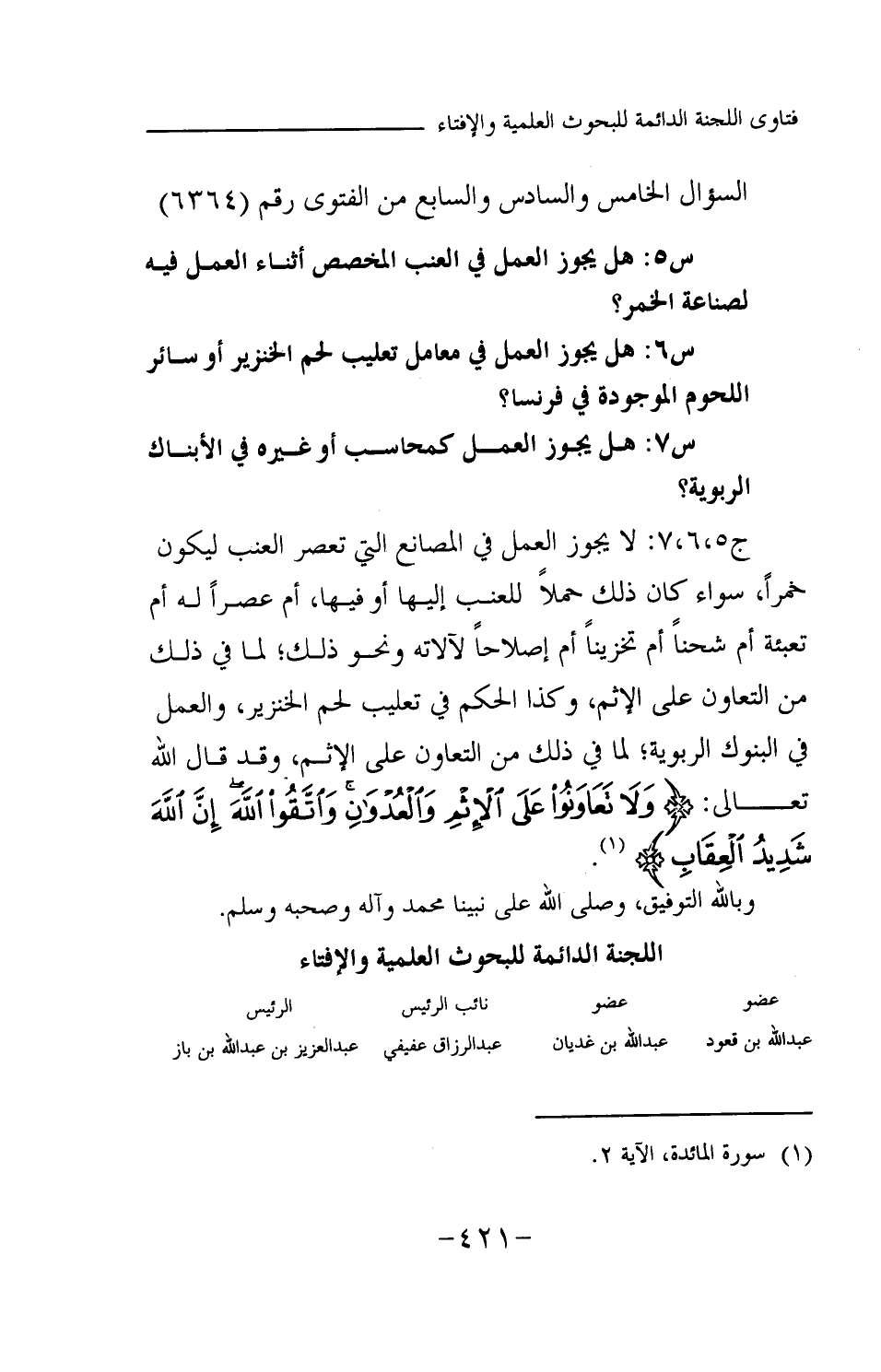 ج5، 6، 7: لا يجوز العمل في المصانع التي تعصر العنب ليكون خمرا، سواء كان ذلك حملا للعنب إليها أو فيها، أم عصرا له أم تعبئة أم شحنا أم تخزينا أم إصلاحا لآلاته ونحو ذلك؛ لما في ذلك من التعاون على الإثم، وكذا الحكم في تعليب لحم الخنزير، والعمل في البنوك الربوية، لما في ذلك من التعاون على الإثم، وقد قال الله تعالى: {وَلَا تَعَاوَنُوا عَلَى الْإِثْمِ وَالْعُدْوَانِ وَاتَّقُوا اللَّهَ إِنَّ اللَّهَ شَدِيدُ الْعِقَابِ} (¬1) وبالله التوفيق، وصلى الله على نبينا محمد وآله وصحبه وسلم.