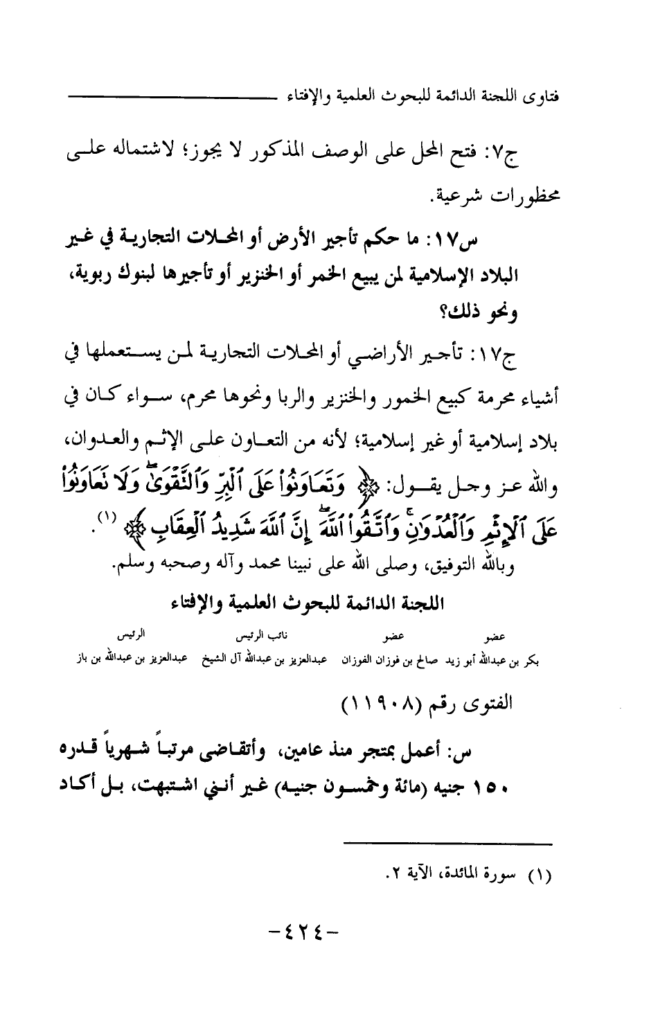 ج17: تأجير الأراضي أو المحلات، التجارية لمن يستعملها في أشياء محرمة كبيع الخمور والخنزير والربا ونحوها محرم، سواء كان في بلاد إسلامية أو غير إسلامية؛ لأنه من التعاون على الإثم والعدوان، والله عز وجل يقول: {وَتَعَاوَنُوا عَلَى الْبِرِّ وَالتَّقْوَى وَلَا تَعَاوَنُوا عَلَى الْإِثْمِ وَالْعُدْوَانِ وَاتَّقُوا اللَّهَ إِنَّ اللَّهَ شَدِيدُ الْعِقَابِ} (¬1) وبالله التوفيق، وصلى الله على نبينا محمد وآله وصحبه وسلم.