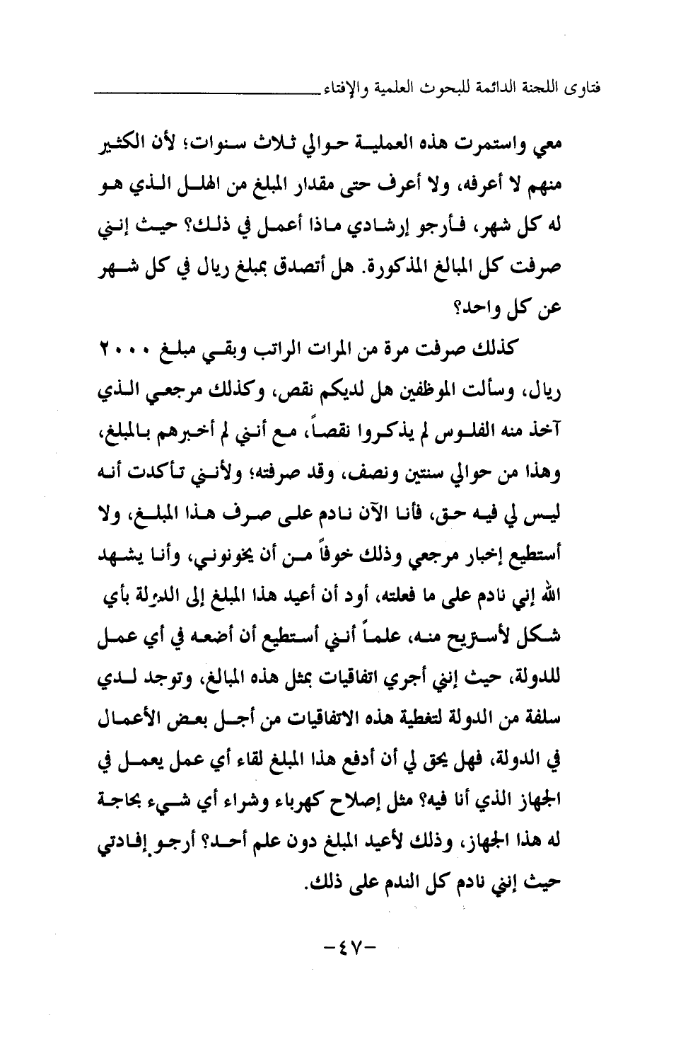 كذلك صرفت مرة من المرات الراتب وبقي مبلغ 2000 ريال، وسألت الموظفين هل لديكم نقص، وكذلك مرجعي الذي آخذ منه الفلوس لم يذكروا نقصا، مع أنني لم أخبرهم بالمبلغ، وهذا من حوالي سنتين ونصف، وقد صرفته؛ ولأنني تأكدت أنه ليس لي فيه حق، فأنا الآن نادم على صرف هذا المبلغ، ولا أستطيع إخبار مرجعي وذلك خوفا من أن يخونوني، وأنا يشهد الله أني نادم على ما فعلته، أود أن أعيد هذا المبلغ إلى الدولة بأي شكل لأستريح منه، علما أنني أستطيع أن أضعه في أي عمل للدولة، حيث إنني أجري اتفاقيات بمثل هذه المبالغ، وتوجد لدي سلفة من الدولة لتغطية هذه الاتفاقيات من أجل بعض الأعمال في الدولة، فهل يحق لي أن أدفع هذا المبلغ لقاء أي عمل يعمل في الجهاز الذي أنا فيه؟ مثل إصلاح كهرباء وشراء أي شيء بحاجة له هذا الجهاز، وذلك لأعيد المبلغ دون علم أحد؟ أرجو إفادتي حيث إنني نادم كل الندم على ذلك.