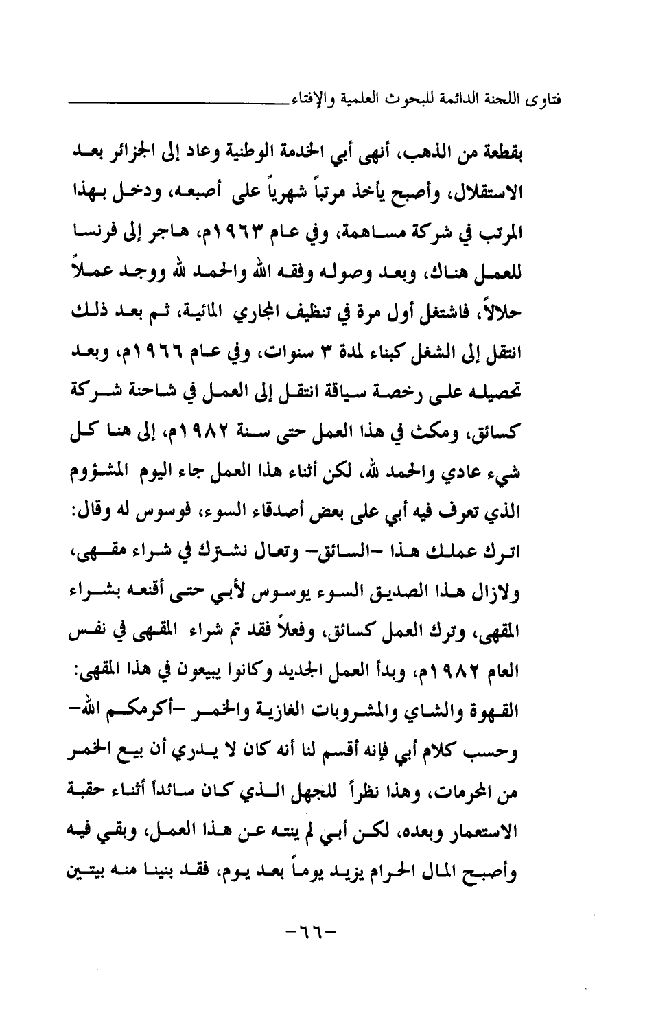 بقطعة من الذهب، أنهى أبي الخدمة الوطنية وعاد إلى الجزائر بعد الاستقلال، وأصبح يأخذ مرتبا شهريا على أصبعه، ودخل بهذا المرتب في شركة مساهمة، وفي عام 1963 م، هاجر إلى فرنسا للعمل هناك، وبعد وصوله وفقه الله والحمد لله ووجد عملا حلالا، فاشتغل أول مرة في تنظيف المجاري المائية، ثم بعد ذلك انتقل إلى الشغل كبناء لمدة 3 سنوات، وفي عام 1966 م، وبعد تحصيله على رخصة سياقة انتقل إلى العمل في شاحنة شركة كسائق، ومكث في هذا العمل حتى سنة 1982م، إلى هنا كل شيء عادي والحمد لله، لكن أثناء هذا العمل جاء اليوم المشؤوم الذي تعرف فيه أبي على بعض أصدقاء السوء، فوسوس له وقال: اترك عملك هذا -السائق- وتعال نشترك في شراء مقهى، ولا زال هذا الصديق السوء يوسوس لأبي حتى أقنعه بشراء المقهى، وترك العمل كسائق، وفعلا فقد تم شراء المقهى في نفس العام 1982 م، وبدأ العمل الجديد وكانوا يبيعون في هذا المقهى: القهوة والشاي والمشروبات الغازية والخمر -أكرمكم الله- وحسب كلام أبي فإنه أقسم لنا أنه كان لا يدري أن بيع الخمر من المحرمات، وهذا نظرا للجهل الذي كان سائدا أثناء حقبة الاستعمار وبعده، لكن أبي لم ينته عن هذا العمل، وبقي فيه وأصبح المال الحرام يزيد يوما بعد يوم، فقد بنينا منه بيتين