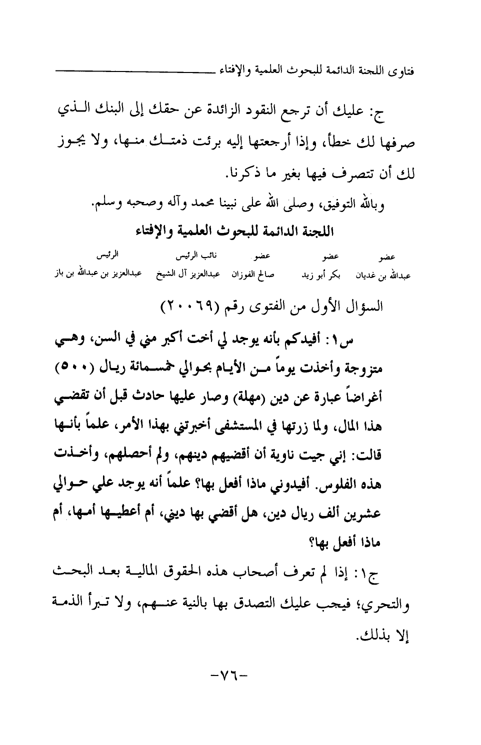 ج: عليك أن ترجع النقود الزائدة عن حقك إلى البنك الذي صرفها لك خطأ، وإذا أرجعتها إليه برئت ذمتك منها، ولا يجوز لك أن تتصرف فيها بغير ما ذكرنا. وبالله التوفيق، وصلى الله على نبينا محمد وآله وصحبه وسلم.