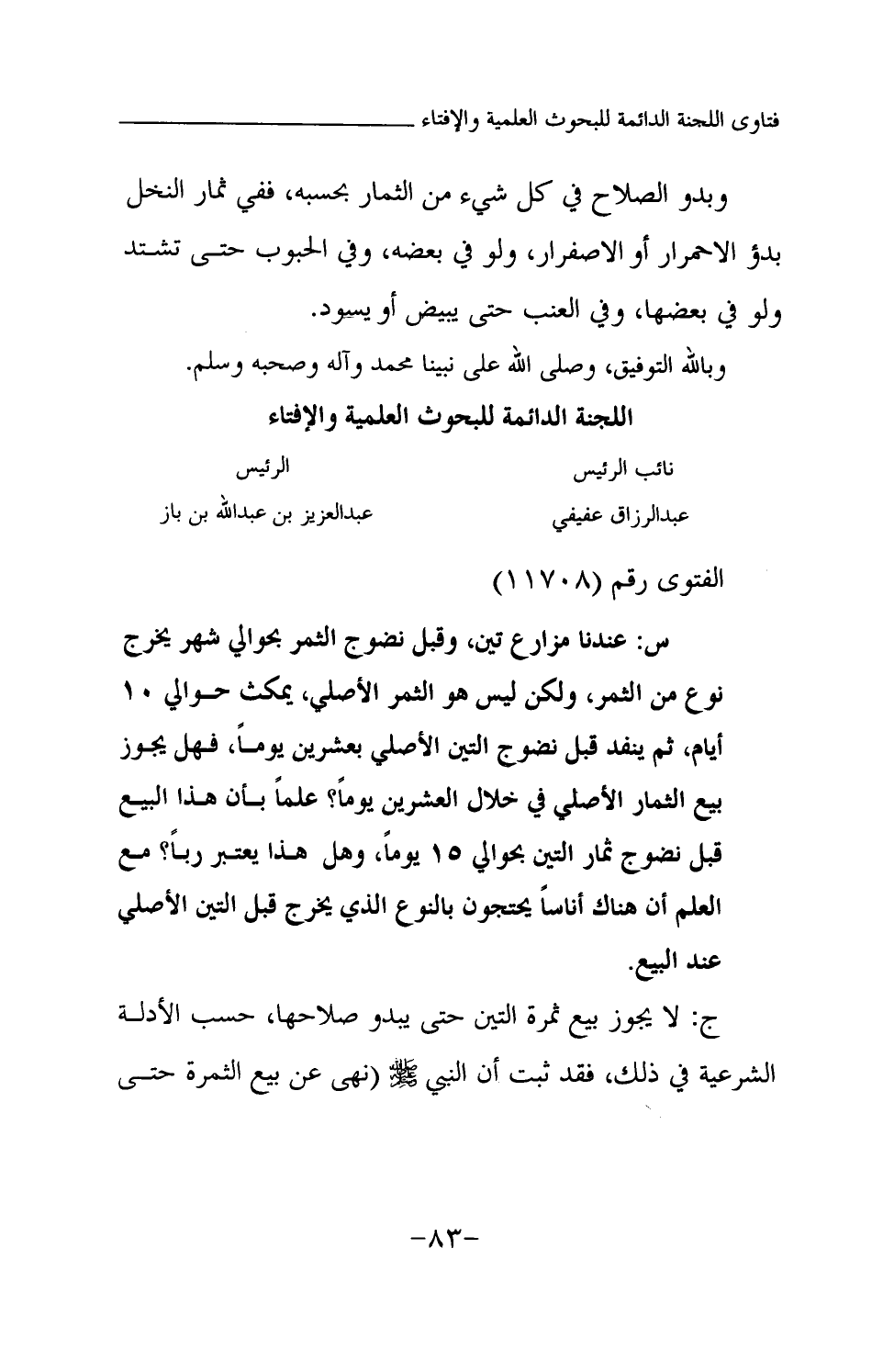 ج: لا يجوز بيع ثمرة التين حتى يبدو صلاحها، حسب الأدلة الشرعية في ذلك، فقد ثبت «أن النبي -صلى الله عليه وسلم- نهى عن بيع الثمرة حتى يبدو صلاحها (¬1) »