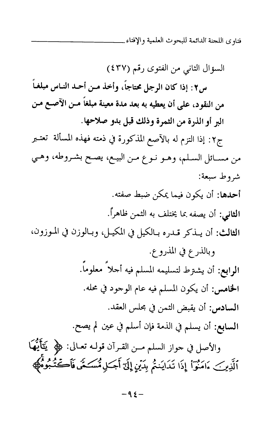 ج2: إذا التزم له بالآصع المذكورة في ذمته فهذه المسألة تعتبر من مسائل السلم، وهو نوع من البيع، يصح بشروطه، وهي شروط سبعة: أحدها: أن يكون فيما يمكن ضبط صفته. الثاني: أن يصفه بما يختلف به الثمن ظاهرا. الثالث: أن يذكر قدره بالكيل في المكيل، وبالوزن في الموزون، وبالذرع في المذروع. الرابع: أن يشترط لتسليمه المسلم فيه أجلا معلوما. الخامس: أن يكون المسلم فيه عام الوجود في محله. السادس: أن يقبض الثمن في مجلس العقد. السابع: أن يسلم في الذمة، فإن أسلم في عين لم يصح. والأصل في جواز السلم من القرآن قوله تعالى: {يَا أَيُّهَا الَّذِينَ آمَنُوا إِذَا تَدَايَنْتُمْ بِدَيْنٍ إِلَى أَجَلٍ مُسَمًّى فَاكْتُبُوهُ} (¬1) الآية،