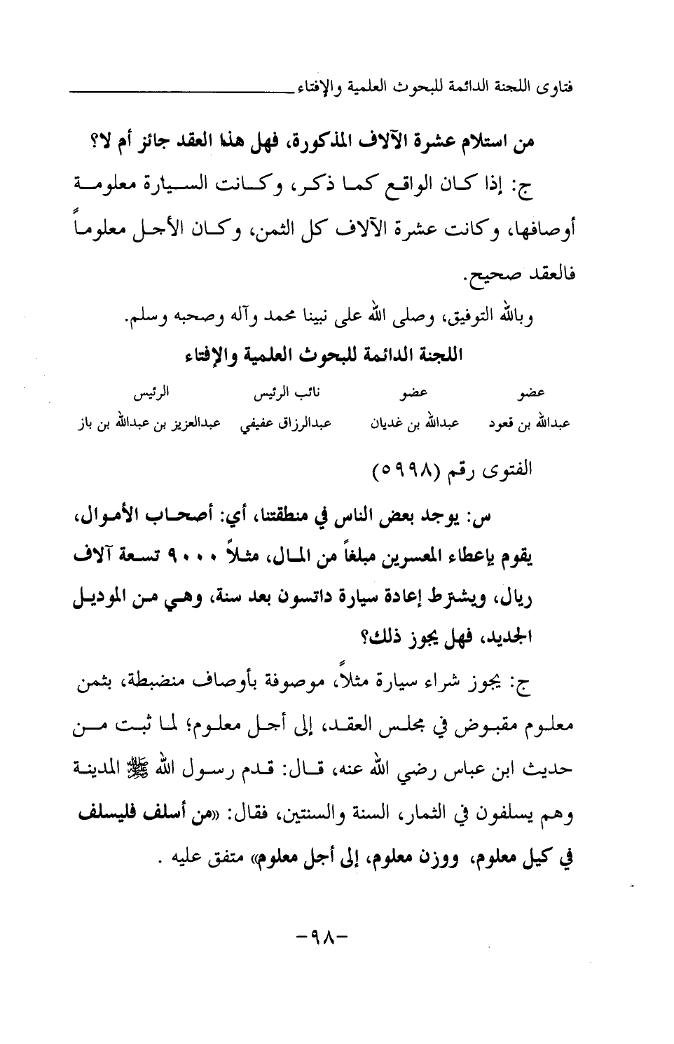 ج: يجوز شراء سيارة مثلا، موصوفة بأوصاف منضبطة، بثمن معلوم مقبوض في مجلس العقد، إلى أجل معلوم؛ لما ثبت من حديث ابن عباس -رضي الله عنه- قال: «قدم رسول الله -صلى الله عليه وسلم- المدينة وهم يسلفون في الثمار، السنة والسنتين، فقال: من أسلف فليسلف في كيل معلوم، ووزن معلوم، إلى أجل معلوم (¬1) » متفق عليه.