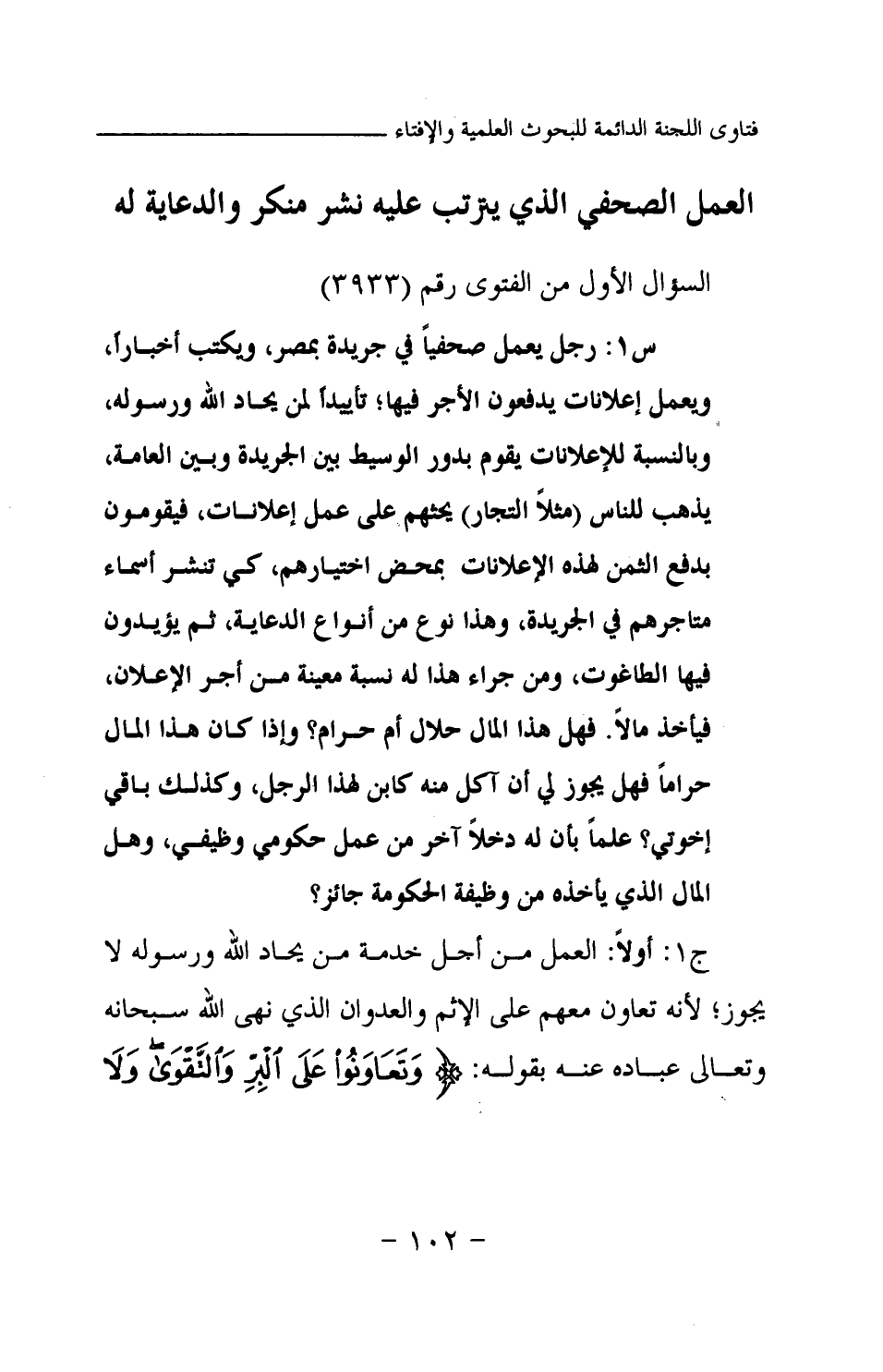 س1: رجل يعمل صحفيا في جريدة بمصر ويكتب أخبارا، ويعمل إعلانات يدفعون الأجر فيها تأييدا لمن يحاد الله ورسوله، وبالنسبة للإعلانات يقوم بدور الوسيط بين الجريدة وبين العامة، يذهب للناس (مثلا التجار) يحثهم على عمل إعلانات، فيقومون بدفع الثمن لهذه الإعلانات بمحض اختيارهم، كي تنشر أسماء متاجرهم في الجريدة، وهذا نوع من أنواع الدعاية، ثم يؤيدون فيها الطاغوت، ومن جراء هذا له نسبة معينة من أجر الإعلان، فيأخذ مالا. فهل هذا المال حلال أم حرام؟ وإذا كان هذا المال حراما فهل يجوز لي أن آكل منه كابن لهذا الرجل، وكذلك باقي إخوتي؟ علما بأن له دخلا آخر من عمل حكومي وظيفي، وهل المال الذي يأخذه من وظيفة الحكومة جائز؟